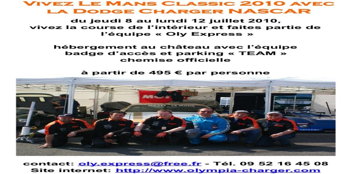 Parallèlement à Michael Schumacher qui revient en F1, la Dodge Charger du Blog Auto va courrir une troisième fois au Le Mans Classic les 9-10-11 jillet 2010. Quand on pense que la plupart des voitures des 24 Heures ne dépassent pas le stade des deux participations, on pourrait croire qu’une troisième sélection d’affilée de Le Mans Classic: tenues inspirées de l’époque, voiture rutilante, bonne ambiance et cartes souvenir gratuites pour les fans! Vous pouvez même faire partie de l’équipe en réservant dès à présent votre package VIP pour Le Mans Classic 2010! Avis à ceux et celles à qui il manque un dernier cadeau de Noël…