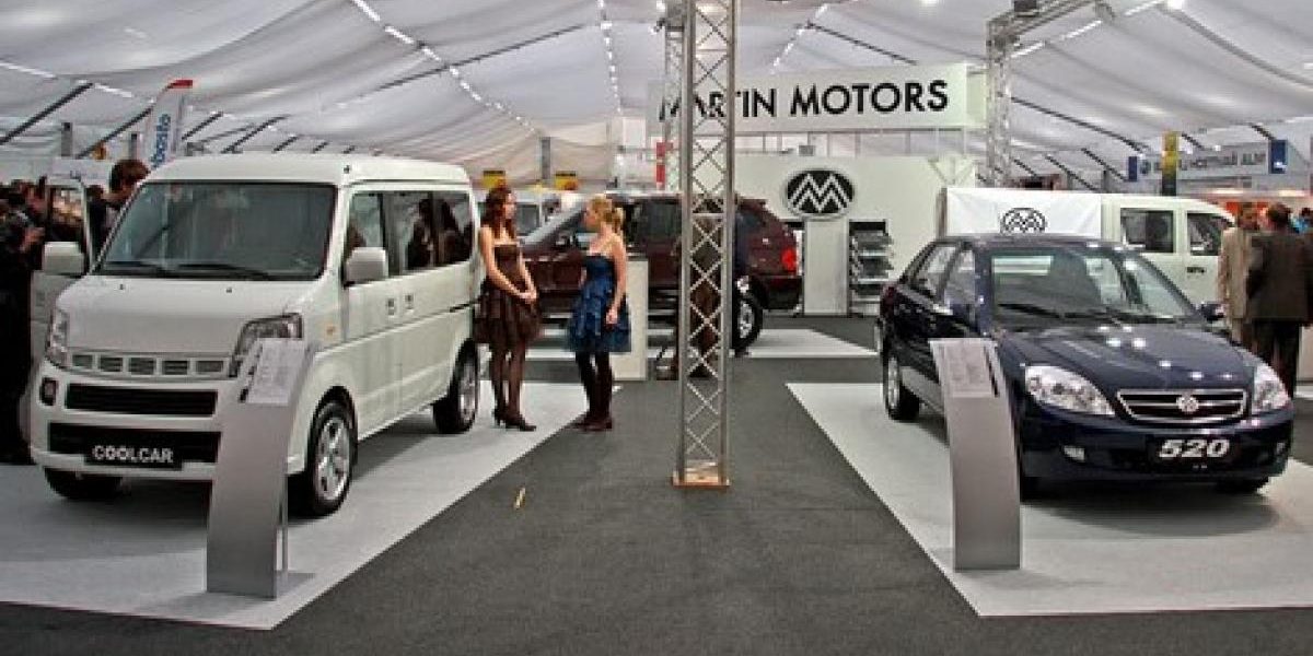 Une vue du salon automobile de Prague 2009, avec (de gauche à droite) une ChangHe, un Shuanghuan, une Lifan et une autre ChangHe, au fond. Dans les rues, par contre, les voitures Chinoises sont nettement plus rares…