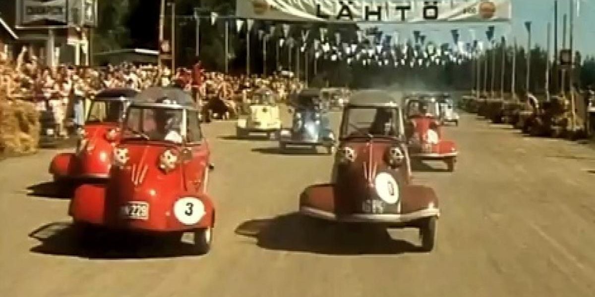 Il y a des jours où la surveillance obsessionnelle de l’internet automobile apporte des satisfactions. On se jette de bon dimanche matin, encore dans les brumes de la veille, sur l’agrégateur RSS, et on commence à lire les titres. Ca commence doucement : photos de l’Audi A7 (bâillements), les nouvelles aventures de Milka Duno (pour JJO, ça), Mercedes CL AMG (pitié, pas avant le petit déj’), et ainsi de suite… Jusqu’à tomber sur une pépite qui fait oublier l’heure matinale, les supplications des enfants qui réclament leur petit déjeuner et le chien qui gratte à la porte. Aujourd’hui, c’est via le toujours impeccable Hemmings Blog que nous arrive la merveille : 1mn14 de Messerchmitt KR200 bardées de numéros en décousant sur une piste en terre finlandaise.