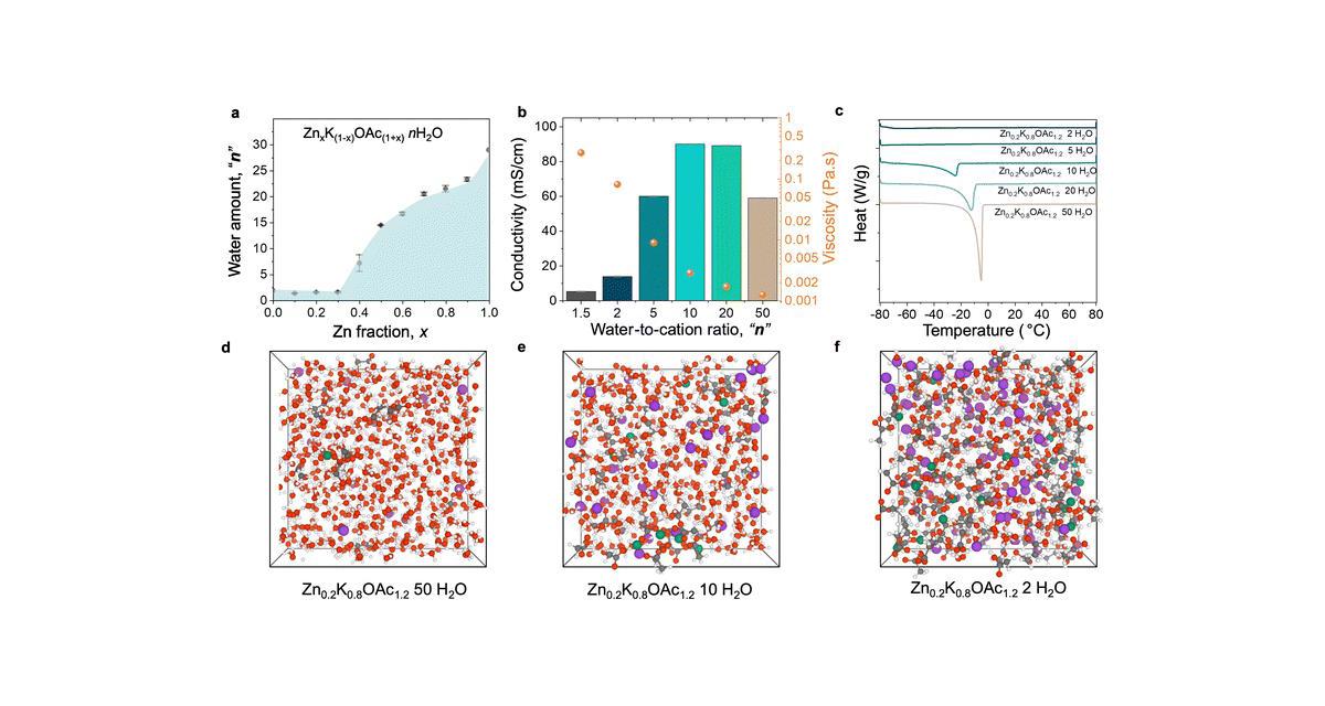 Contrairement aux premières pistes suivies qui mettaient une concentration très importante de sels, ici, l'approche est de trouver la concentration idéale. Et cette concentration peut être très faible selon les chercheurs, en choisissant bien les ions utilisés. "In conclusion, we demonstrate that coordinating anions such as acetate can create a WIS-like coordination environments in electrolytes that are relatively dilute. Using XAS and MD simulations we show that in a non-concentrated state, the Zn2+ coordination environment is already WIS-like, with Zn2+ ions being predominantly coordinated by acetate rather than water".