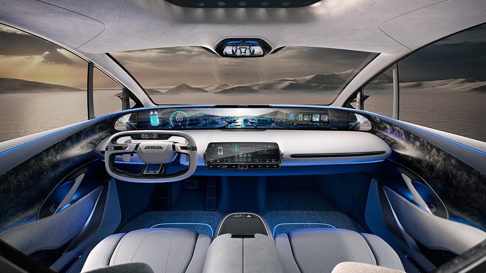 Esthétiquement, on a une 4 portes à ouverture antagoniste, et en élytre. Il faut bien faire de l'esbrouffe, non ? Aehra parle encore de véhicule "ultra premium". La limite entre premium et luxe est-elle si large qu'on peut y mettre un cran de plus comme "ultra-premium" ? L'intérieur est composé de quatre baquets individuels. La planche de bord a un immense écran qui peu s'escamoter en partie. C'est doublé par un écran central plus classique. C'est le même intérieur que le SUV…