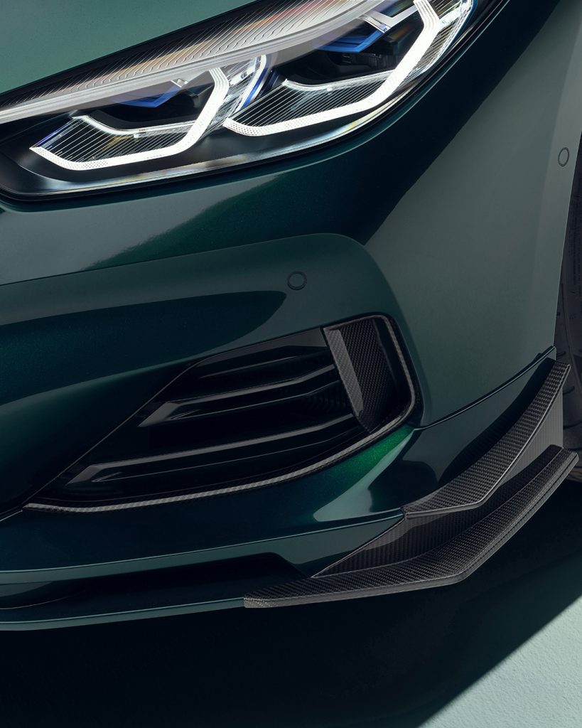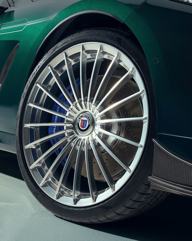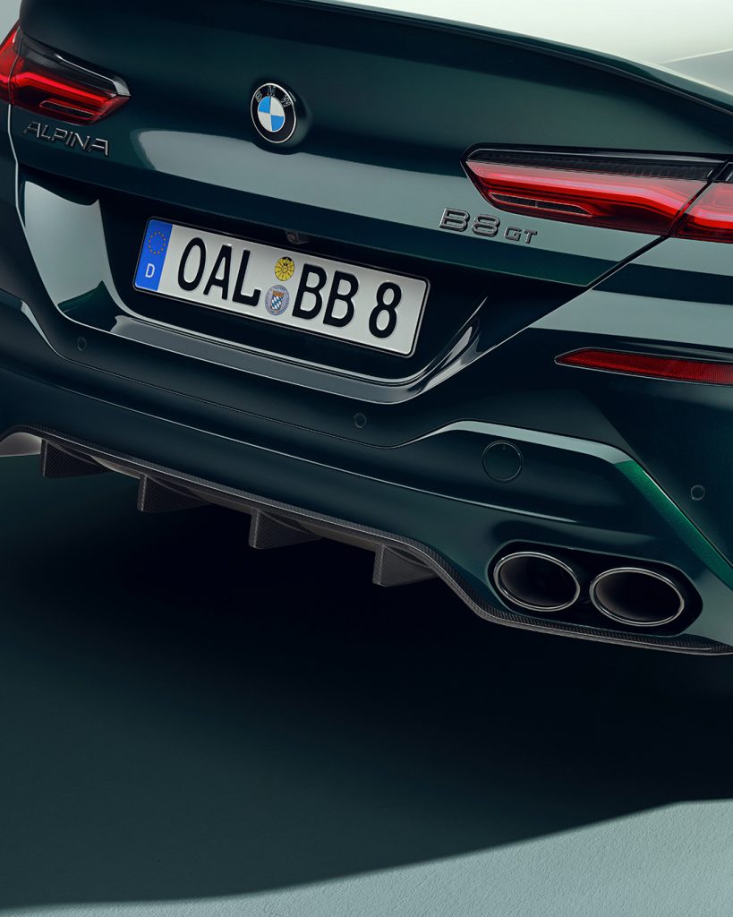 Les touches extérieures sur mesure qui distinguent la GT des autres Gran Coupé Série 8 comprennent un diffuseur, des conduits d’air et des plans de plongée, tous fabriqués en carbone, ainsi que les roues forgées de 21 pouces d’Alpina, dont les enjoliveurs centraux sont usinés à partir de pièces solides d’aluminium.