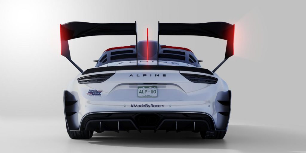 On observe des splitters extrêmement marqués et des déflecteurs sur les extrémités du bouclier, sans oublier l’aileron arrière imposant, scindé en deux, pour générer de l’appui dans les 156 virages de la course, associé à l’intégration d’un aileron de requin « type Le Mans » sur la lunette arrière. Le travail de radicalité effectué sur l’Alpine A110R lui bénéficie aussi, à travers les jupes latérales et le diffuseur, tandis qu’une entrée d’admission fait son apparition sur le pavillon pour gaver en air le moteur porté à près de 500 chevaux. Un travail spécifique a également été réalisé sur le poids afin d’abaisser la masse du modèle à 950 kilos seulement, contre 1 000 pour la version Cup. Avec 2 roues motrices et 500 chevaux, l’Alpine ne jouera pas la victoire scratch absolue de la classe Unlimited, mais plutôt la classe Time Attack 1 où évoluent de nombreuses GT préparées, dont de nombreuses Porsche.