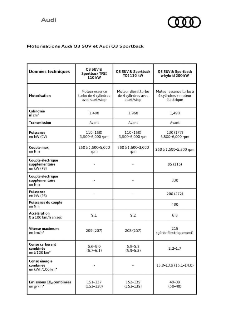 Cette seconde génération de l’Audi Q3 Sportback sera disponible en France en novembre. Les commandes sont ouvertes. La Q3 Sportback TFSI 150ch en finition Design débutera à 46 350 € quand la version e-Hybrid 272 chevaux débutera à 57 500 € en Design.