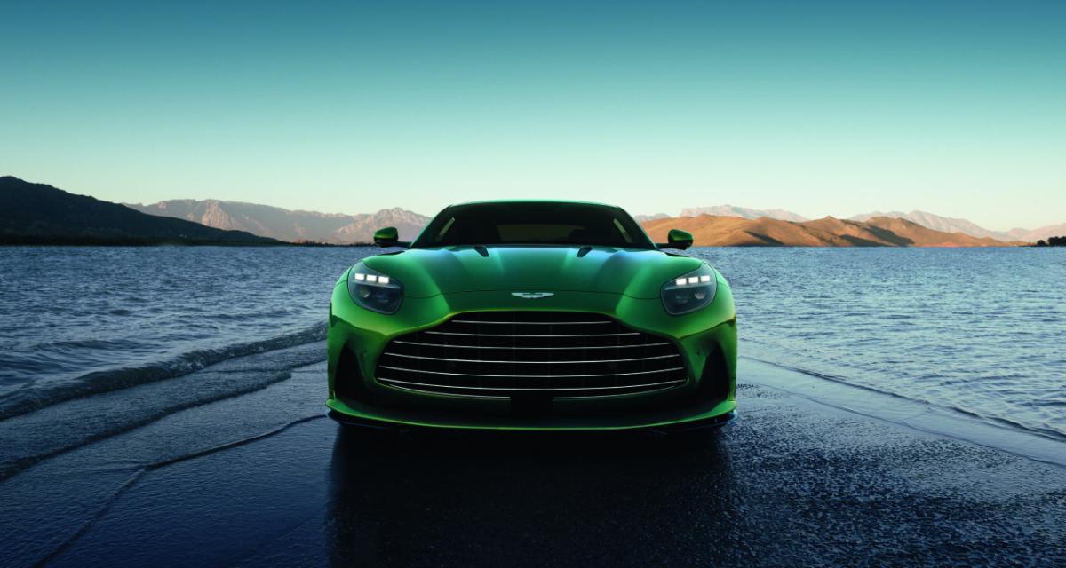 Visuellement, la DB12 est plus imposante et musclée que sa devancière sur la partie avant, avec une augmentation de la voie de 6 mm à l'avant et de 22 m à l'arrière, et surtout une calandre désormais béante qui rappelle la DBS, cette calandre étant enserrée dans sa partie inférieure et latérale par une prise d’air intégrée au bouclier. Les phares à LED présente une nouvelle signature distinctive de feux de jour, avec trois petits blocs rectangulaires dans la partie supérieure du bloc optique – ce qui n’est pas sans rappeller les blocs Porsche – et des détails de surface complexes. Le reste de la DB12 est plus dans la lignée de la DB11, avec les caractéristiques connues de la série DB : un long capot avant, l’échancrure latérale dans le prolongement du passage de roue et la poupe ramassée.