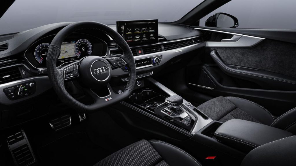 Il y a quelques mois, Audi apportait donc un sérieux restylage à l’A4 berline ou break. Le style de l’A5 a semble-t-il été jugé toujours en accord avec les standards de la marque, et elle se contente donc de revoir classiquement ses boucliers, phares (à LED en série) et feux. A bord, peu de changement de style, hormis l’arrivée de la dernière génération de système d’info-divertissement connecté, avec son écran de 10,1 pouces. Qui est toujours complété par l’écran de 12,3 pouces face au conducteur, et selon l’appel aux options l’affichage tête haute.