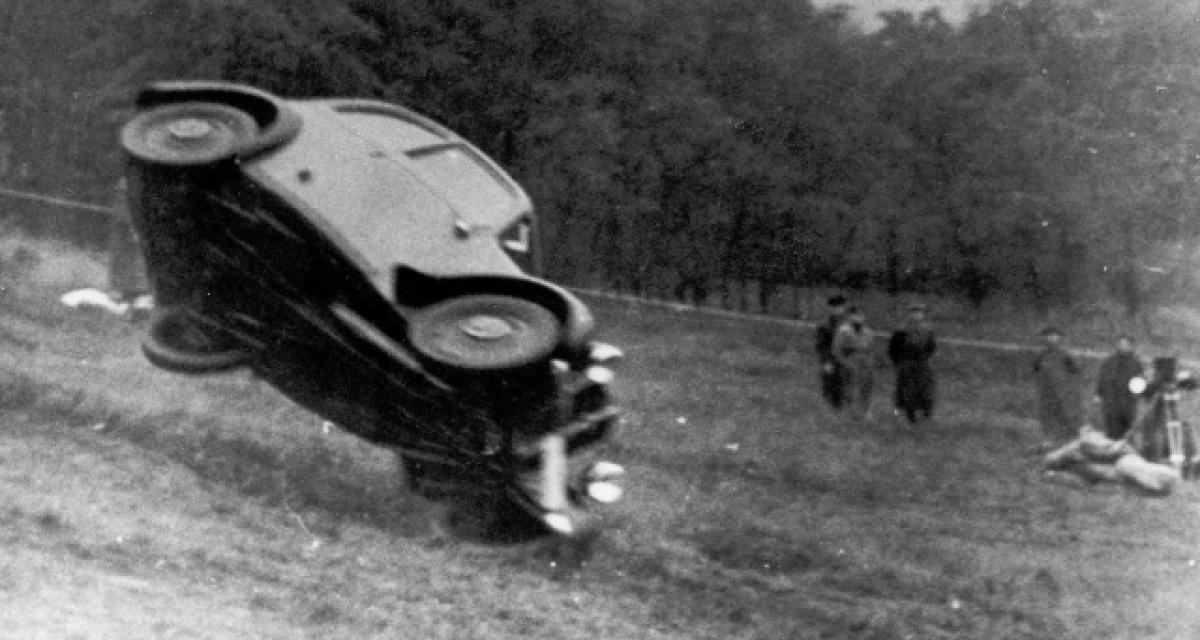 Ce procédé n’est pas sans rappeler un test effectué 4 ans plus tôt par Citroën pour démontrer la solidité de la construction monocoque de la Traction face aux autres type de construction. Pendant qu’une Peugeot et une Renault étaient complètement disloquées après avoir été poussées dans le vide, la Citroën, dans le même exercice, préservait complètement son habitacle pour la sécurité des occupants.