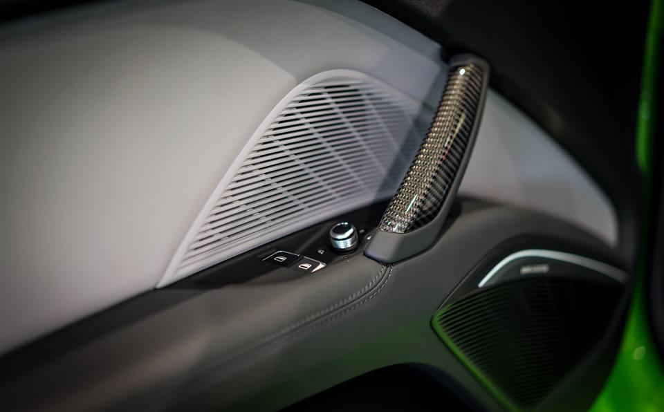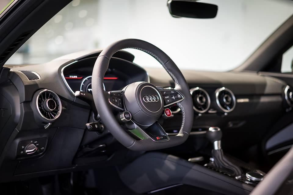 Ce traitement s’accompagne de pointes de noir ci et là ainsi que de fibre de carbone. Ce coupé TT RS est aussi chaussé en enveloppes 255/30 et adopte des jantes alu Rotor de 20″ sept branches.