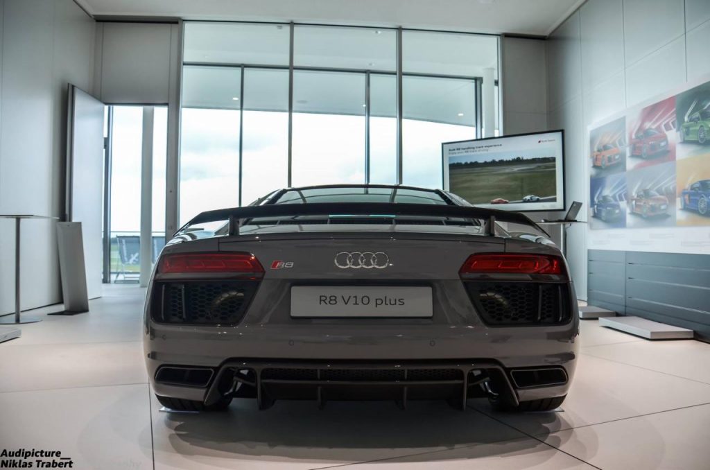 Nouvel exemple des possibilités de personnalisation offertes par le département Audi Exclusive. Après avoir apprécié une RS7 Sportback, c’est une R8 V10 Plus qui est illustrée.