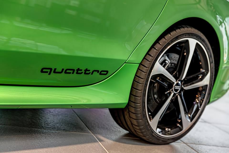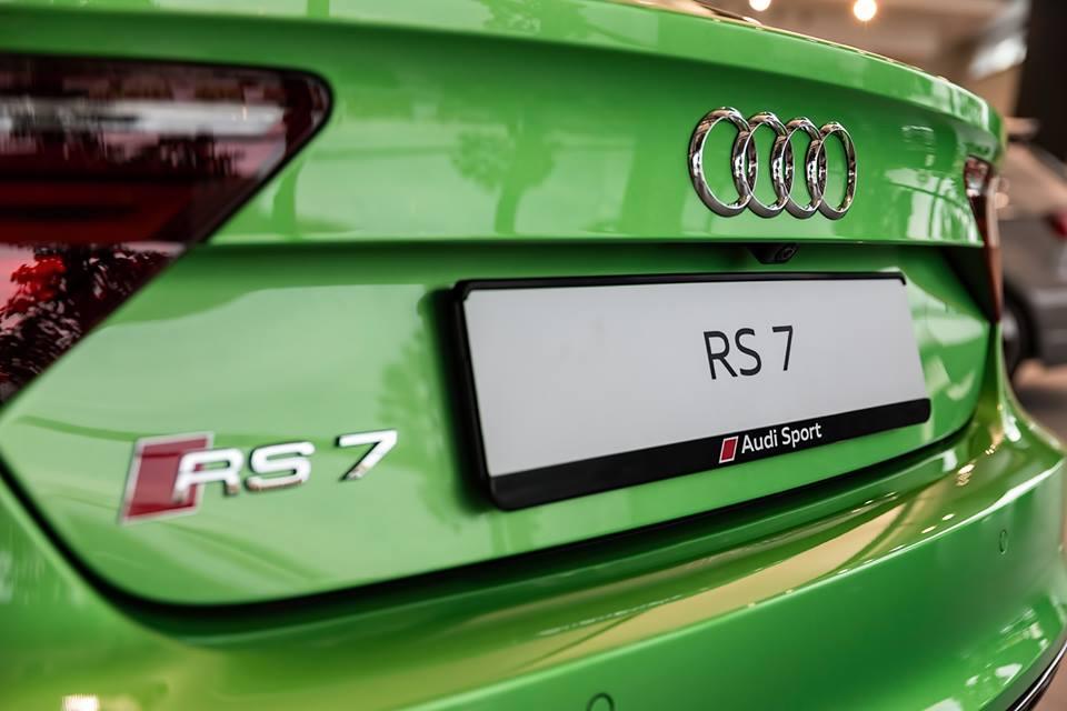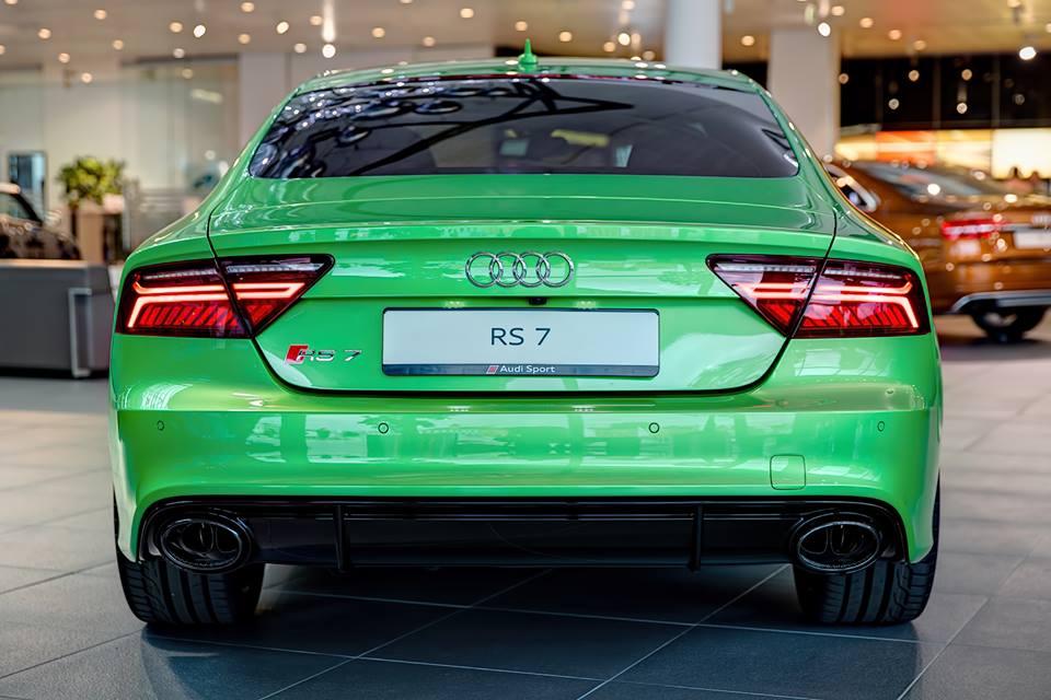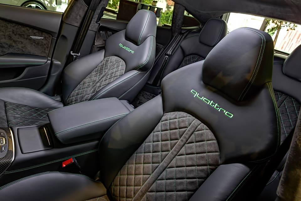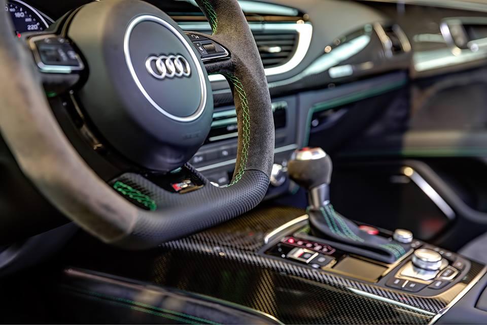 Cette RS7 Sportback joue quelque peu sur les contrastes avec des coques de rétroviseurs en finition ton noir brillant. A noter également la monte de jantes alliage à cinq rayons de 21″ mais aussi la greffe d’un échappement RS Sport.