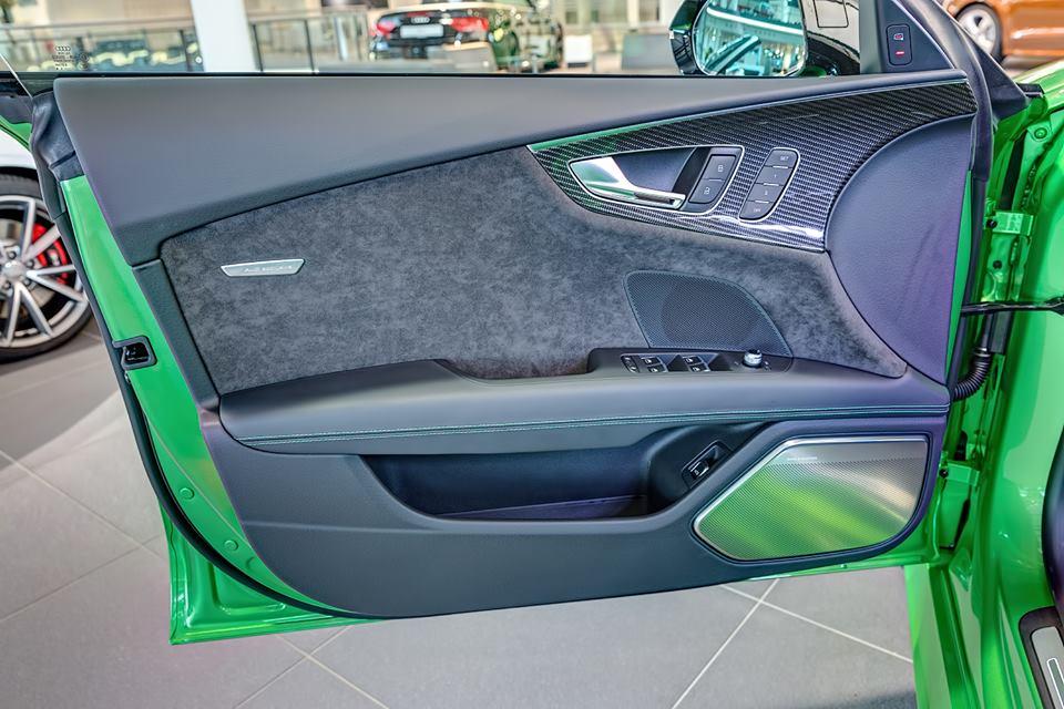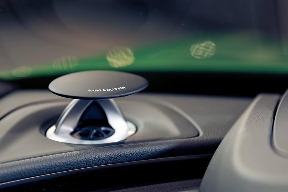 Au sein de l’habitacle, mêmes contrastes entre noir et vert, surpiqures, inserts carbone, sellerie cuir Alcantara quand la liste des équipements a été enrichie avec la monte d’un ensemble audio Bang & Olufsen.