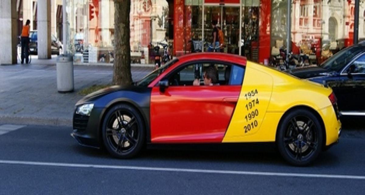 Avant l’heure, ce n’est pas l’heure ! Le propriétaire allemand de cette Audi R8 y croyait dur comme fer au succès de la National Mannschaft pour cette coupe du monde de football. Après 1954, 1974 et 1990 déjà était inscrite l’année 2010 sur le flanc de la supersportive allemande. Manque de chance pour lui, la National Mannschaft a échoué et terminé la compétition en grimpant sur la troisième marche de la galette. Dommage.