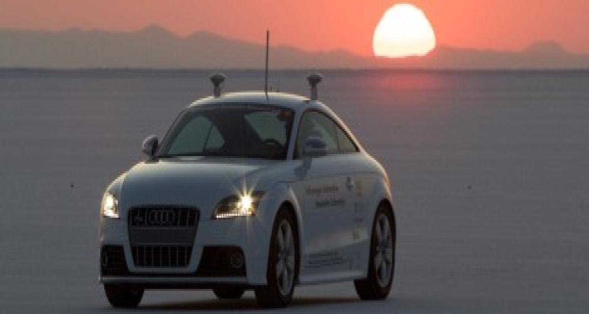 Une Audi TTS sans chauffeur à l’attaque de la périlleuse montée de Pikes Peak ? Oui, c’est possible Fabien vous présentait même hier la chose. Pour revenir un petit peu sur le point de départ, il s’agit du résultat d’une collaboration menée depuis des années entre Volkswagen et l’université de Stanford afin de concevoir et produire diverses innovations technologiques. Ici donc il s’agit d’un véhicule auto-piloté, étude qui rappelle forcément celle récemment dévoilée par Volvo en partenariat avec divers organismes européens. Quant à la TTS qui nous intéresse ce jour, elle revient avec de nouvelles images la dévoilant lors d’une séance de mise au point sur le lac de Bonneville.