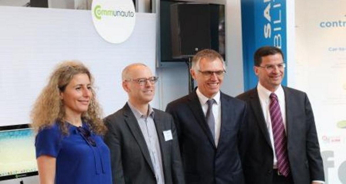 Brigitte Courtehoux, directrice des services connectés et nouvelles mobilités (Groupe PSA), Benoit Robert, PDG et fondateur de Communauto, Carlos Tavares, Président du Directoire du groupe PSA, Grégoire Olivier, Directeur des services de mobilité (Groupe PSA)
