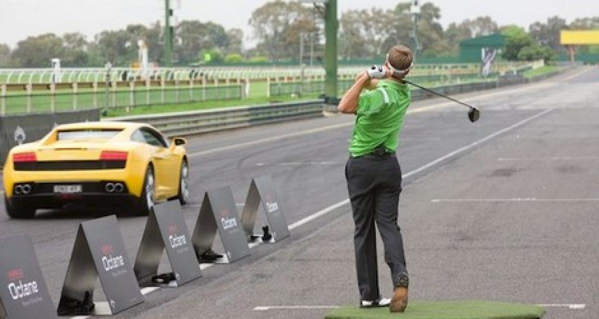 Après un départ, la Lamborghini Gallardo garde la ligne et continue d’accélérer au moment où Stuart Appleby frappe la balle de golf.