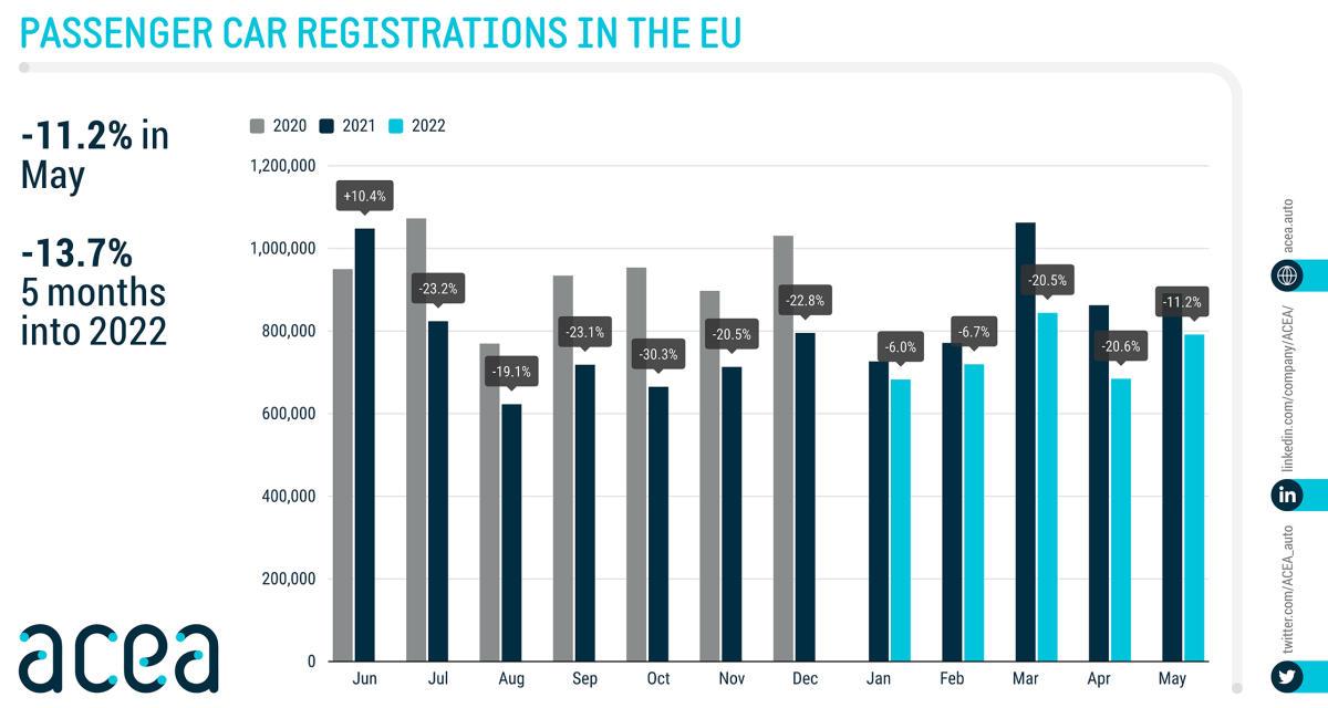 Si on compare ce mois de mai 2022 par rapport aux autres mois de mai, c'est le deuxième pire mois de mai depuis 10 ans. Le minimum est toujours pour l'année 2020. Mais, en année "hors confinements", on est au-dessous de mai 2013 qui était à plus de 850 000 véhicule pour l'UE.