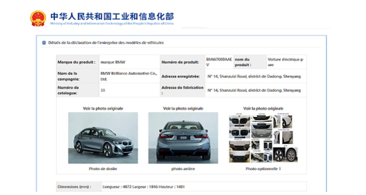 Un véhicule aux allures d’une Série 3 électrique est d’ores et déjà répertorié sur le site Web du ministère chinois de l’Industrie et des Technologies de l’information (MIIT).