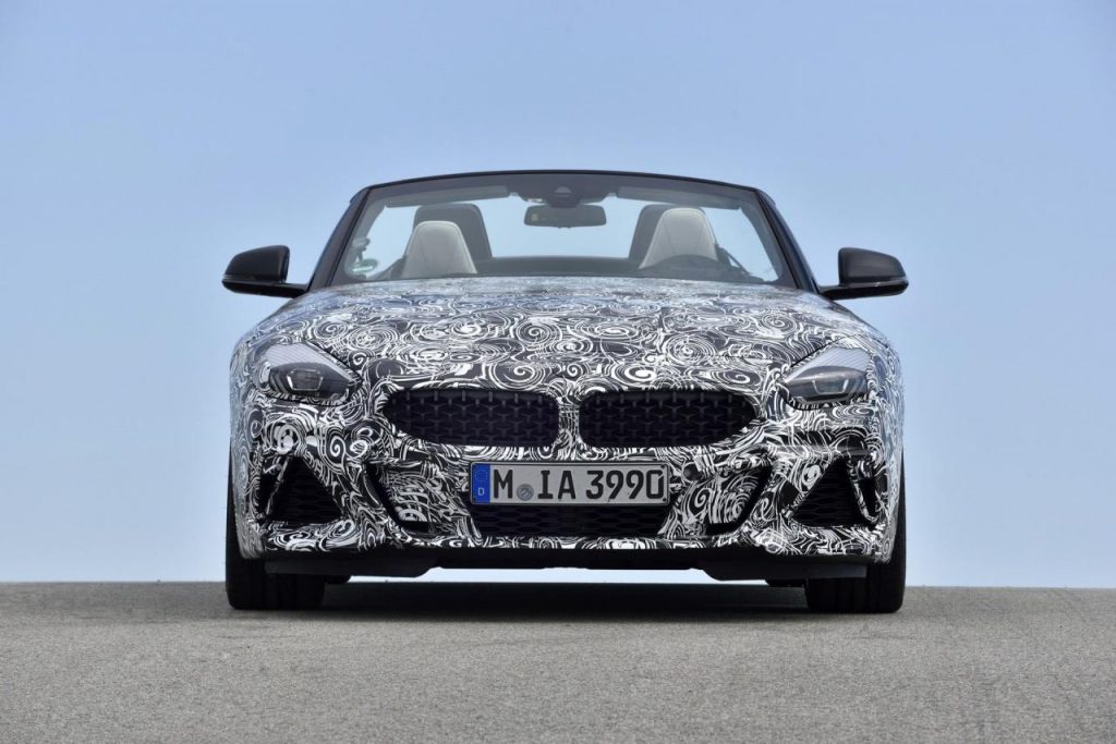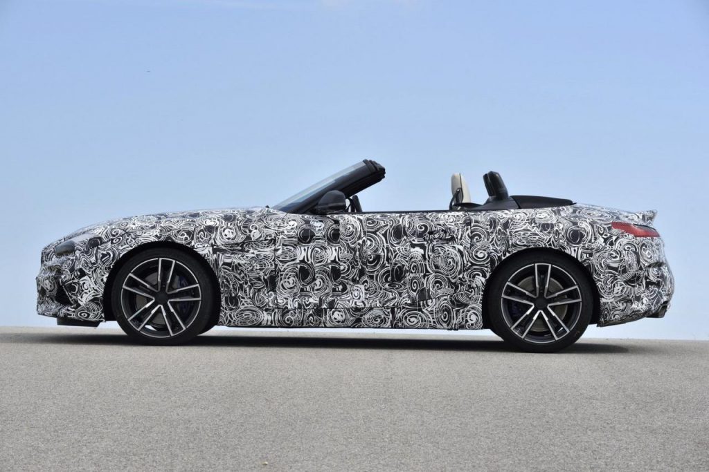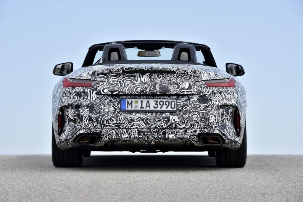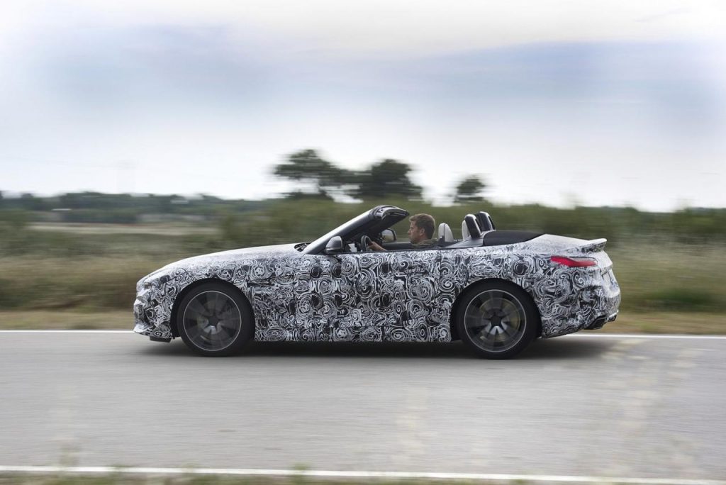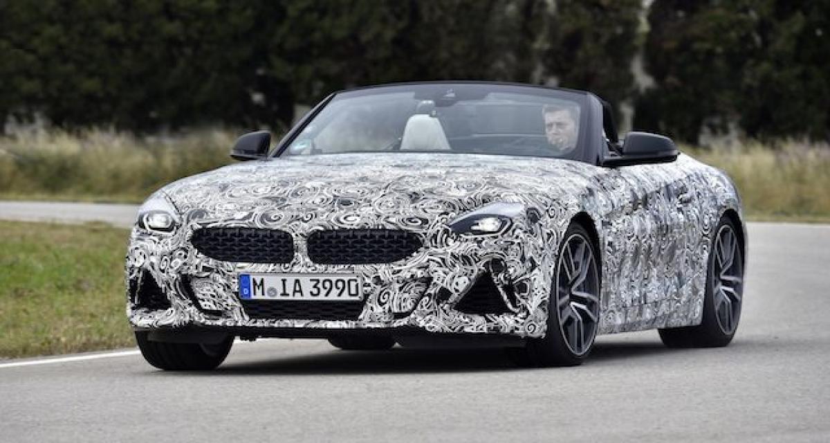BMW a dévoilé des clichés d’un prototype en phase de tests sur le circuit de Miramas, le Z4 M40i, version la plus puissante de ce nouvel opus. Bien que camouflé, on peut deviner un bouclier très échancré à l’avant, un diffuseur à l’arrière et deux larges sorties d’échappement.
