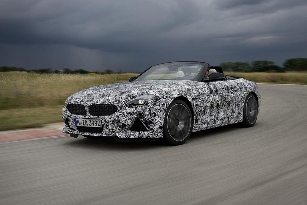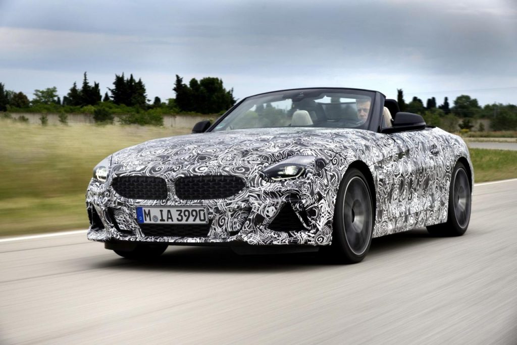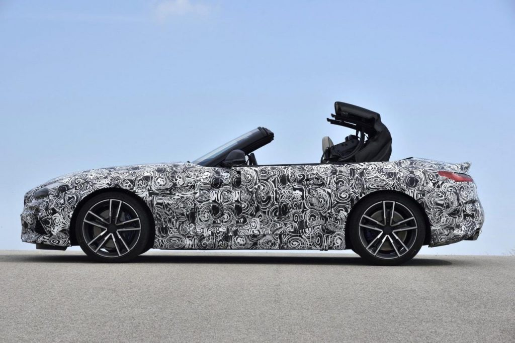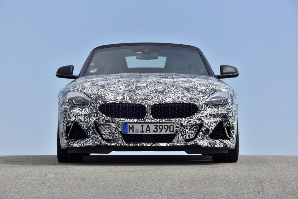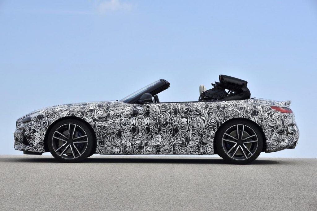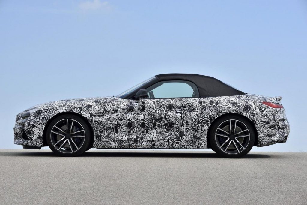 BMW a dévoilé des clichés d’un prototype en phase de tests sur le circuit de Miramas, le Z4 M40i, version la plus puissante de ce nouvel opus. Bien que camouflé, on peut deviner un bouclier très échancré à l’avant, un diffuseur à l’arrière et deux larges sorties d’échappement.