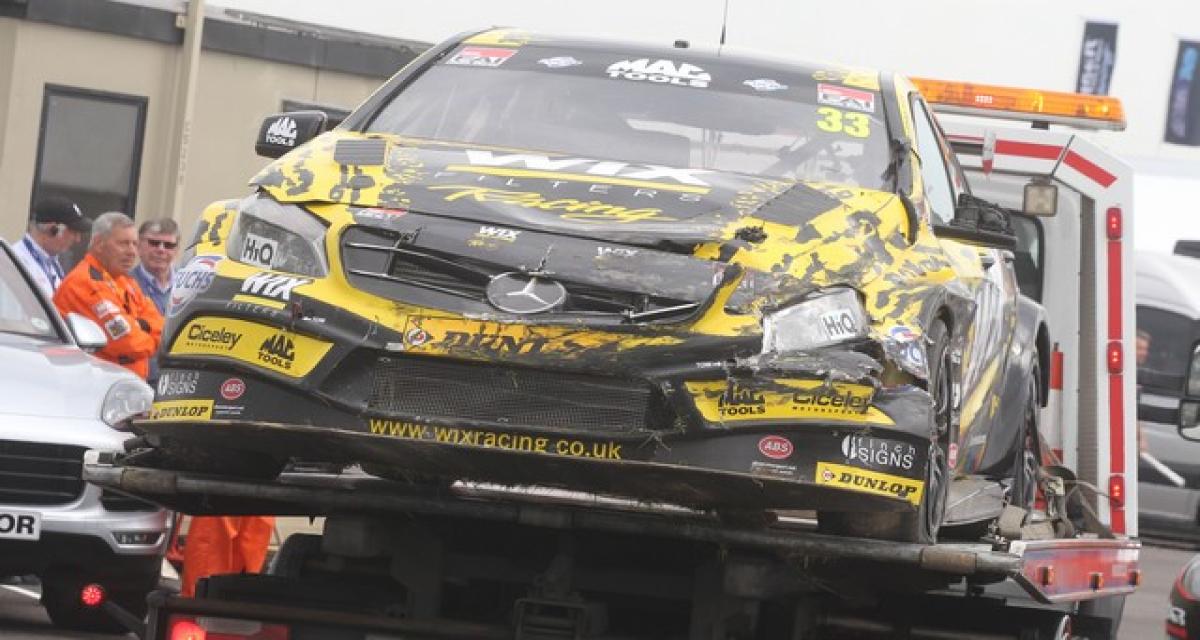 A Thruxton, le BTCC offre un scénario digne d’Hollywood. Voici la Classe A d’Adam Morgan à l’issue des essais. Réparée, elle lui permet de remporter la course 1, le lendemain. Quant à Motorbase, il est au bord de la faillite en 2015, mais il a la meilleue voiture et il remporte les courses 2 et 3 !