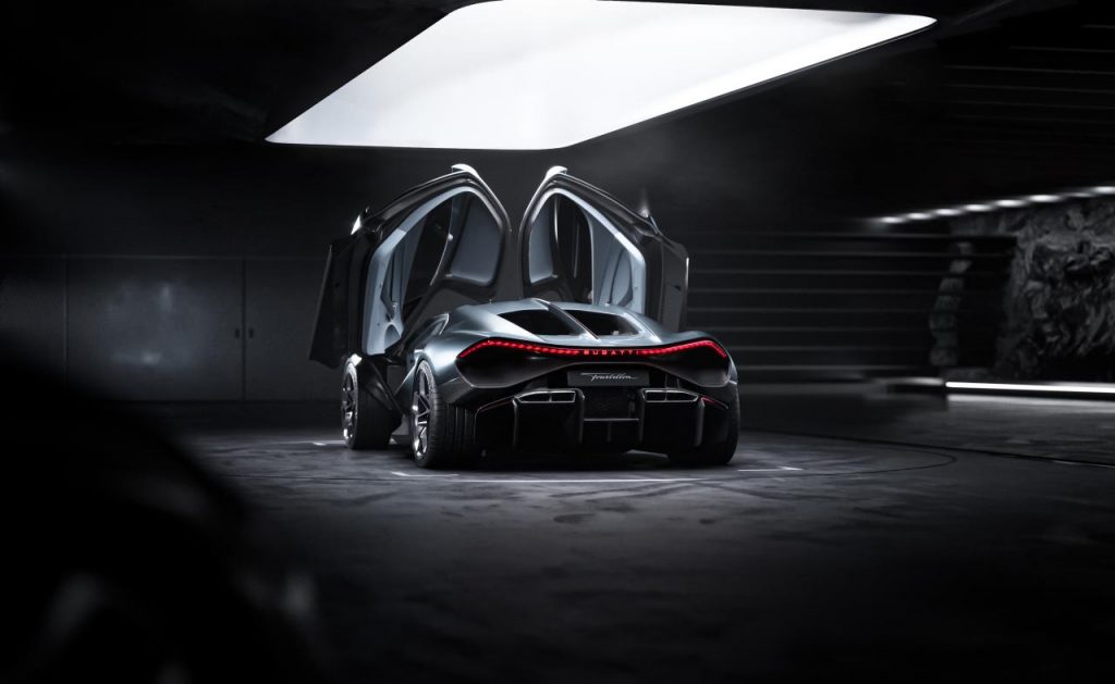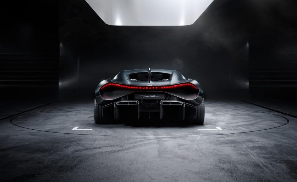 La poupe futuriste, avec ses optiques en « vague » et son énorme diffuseur, se rapproche de La Voiture Noire et de la Mistral. Elle mesure 4,67 mètres de long, soit 13 centimètres de plus que la Chiron. L’aileron arrière est en position rentrée lors des pointes de vitesse. Destiné à augmenter la force d’appui à basse vitesse, il sert d’aérofrein pour améliorer la stabilité en phase de décélération. Cet équilibre aérodynamique est en grande partie le fruit du nouveau concept de diffuseur, qui entame son ascension juste derrière l’habitacle, soit quasiment à la moitié du véhicule, selon un angle optimal, assurant ainsi la stabilité parfaite de la Tourbillon. Deux portières dièdres sophistiquées à commande électrique permettent non seulement de pénétrer facilement dans le véhicule, mais aussi de marquer l’ouverture de manière spectaculaire. Elles peuvent être ouvertes et fermées de trois manières différentes : à partir de la clé, via le bouton d’ouverture se trouvant juste en dessous de la ligne Bugatti, ou enfin celui sur la console centrale.