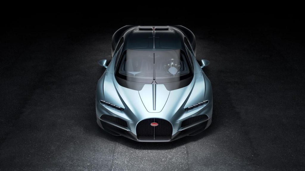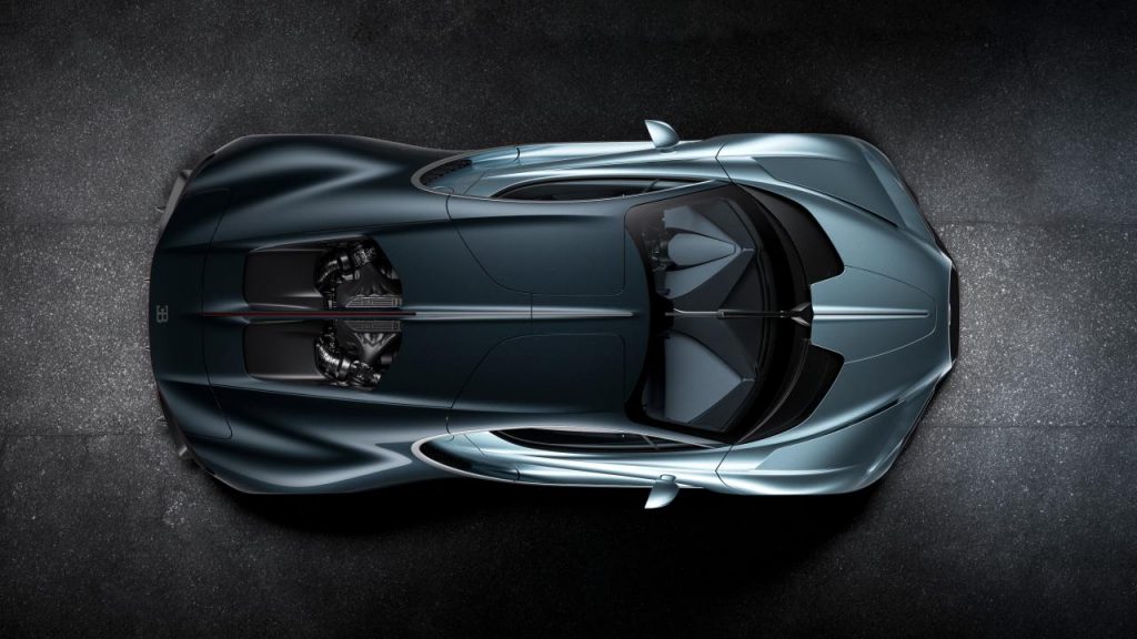 C’est sous l’immense capot que se cache le vrai changement. Propriété de Rimac depuis peu, Bugatti s’avance vers l’électrification, mais conserve tout de même une âme thermique, ce que les fans craignaient de voir disparaître. Le monstrueux W16 gavé par 4 turbos, qui fut la colonne vertébrale de la Veyron puis de la Chiron, laisse place ici à un V16, développé avec le célèbre motoriste Cosworth, accompagné de trois moteurs électriques, deux sur l’avant et un sur l’arrière, à l’instar de la cousine Lamborghini Revuelto. Le bloc thermique atmosphérique à lui seul délivre 1000 CV, grimpe jusqu’à 9000 tours/min et dispose d’une cylindrée de 8.3 litres. Avec l’apport de l’hybride, le groupe délivre au total 1800 chevaux, soit 300 de plus que la Chiron ! Fabriqué à partir de matériaux légers, le moteur ne pèse que 252 kg.