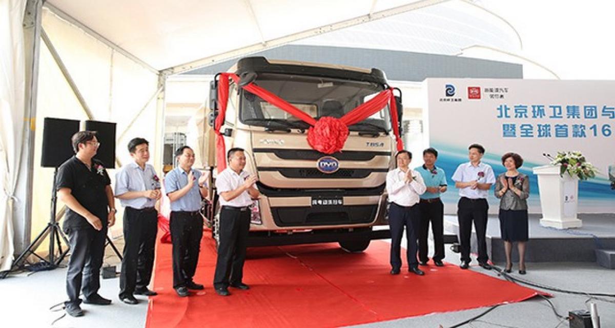 Désormais, Byd compte dupliquer cela avec les camions et les chariots élévateurs électrique. La star, c’est le T9, un châssis-cabine. Avec ses deux moteurs, alimentés par des batteries ion-phosphate, il dispose d’une puissance totale de 482ch. De quoi transporter ses 12t sur 150km et atteindre 90km/h. Grâce à son chargeur-rapide maison, il fait le « plein » en 2,5 heures. A l’été 2015, il livre fièrement 25 balayeuses électrique à la municipalité de Pékin. Un an plus tard, aux Etats-Unis, il s’invite au salon Cleantechnica et y dévoile son bébé. Visiblement, les réactions sont tièdes.