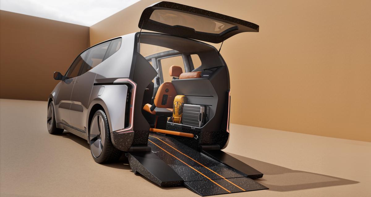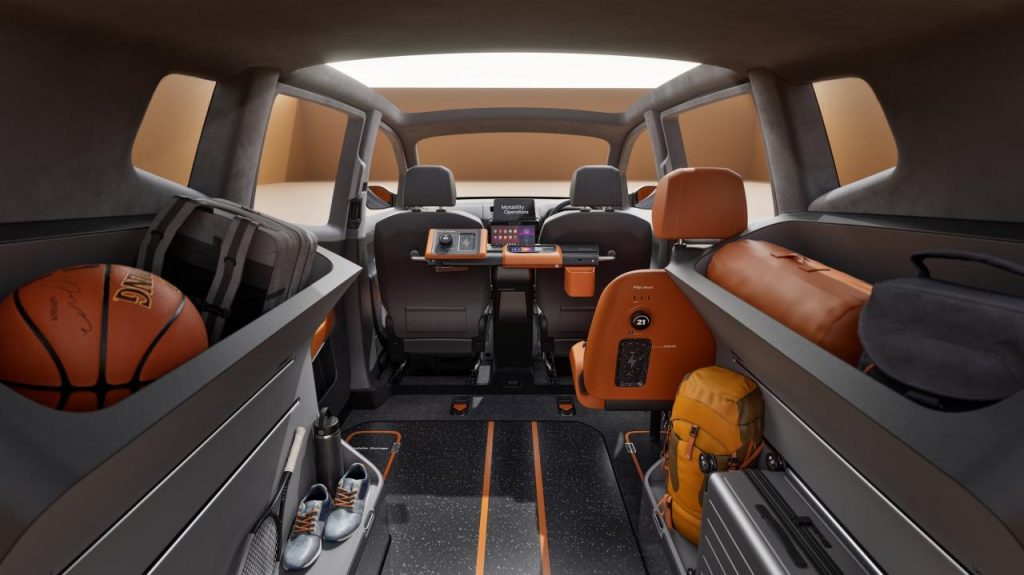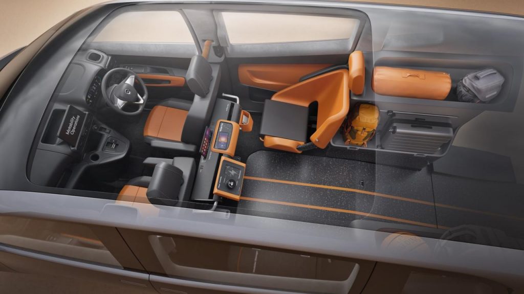 Une fois à l'intérieur, le fauteuil roulant a une place dédiée, quasiment derrière le chauffeur. Le fauteuil arrière peut se transformer en "table" quand personne n'est assis dessus. Et ce passager arrière en fauteuil peut commander la partie info-divertissement, mais aussi la température intérieure, etc.