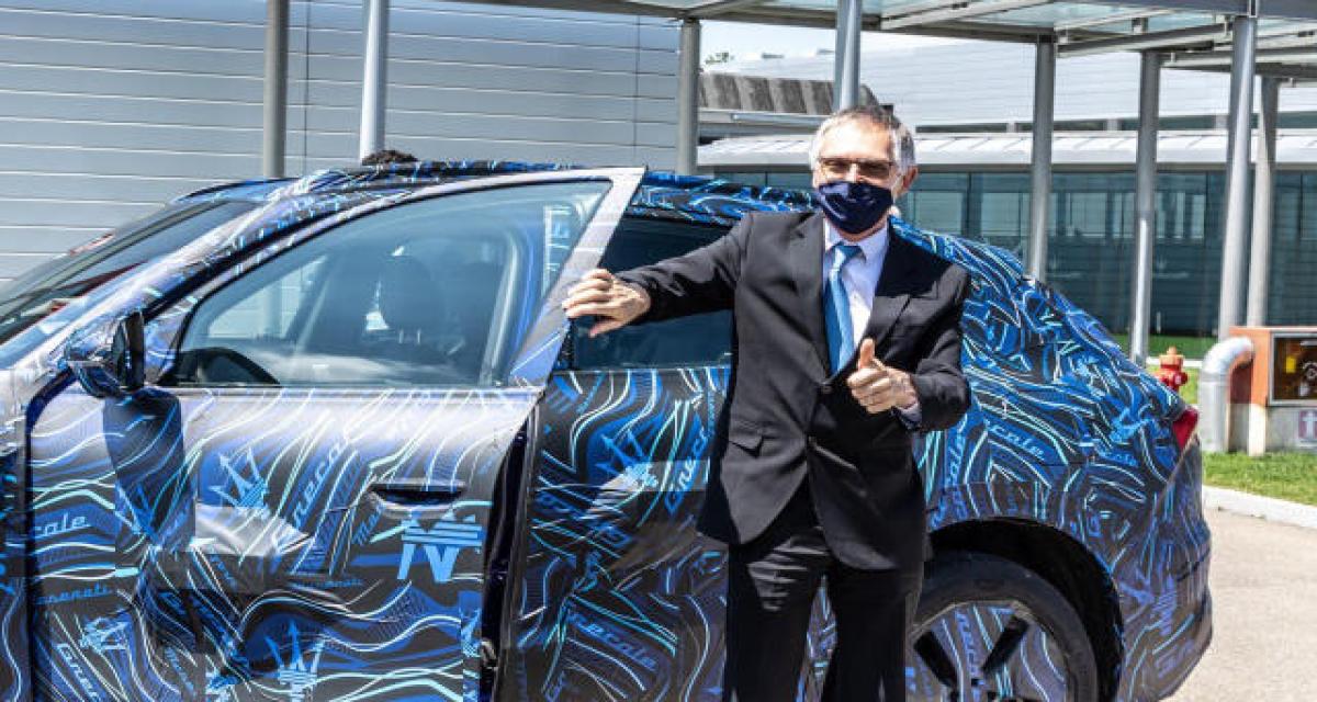 Qu’y voit-on ? Carlos Tavares, le DG de Stellantis, prend le volant d’un Maserati Grecale (probablement un véhicule de pré-série). Si l’on peut deviner globalement le gabarit du véhicule, les détails restent masqués par le camouflage et les blocs de mousse en dessous.