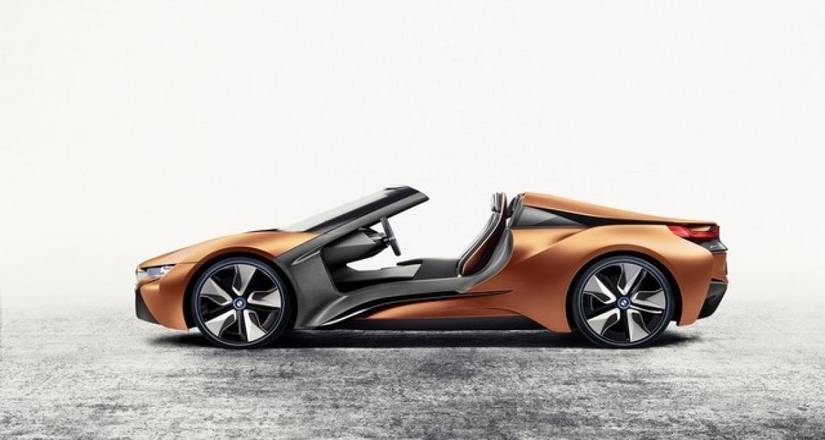 Cette i Vision Future Interaction ? Une resucée du concept i8 Spyder mais cette fois dans une déclinaison amputée de ses portes (évidemment toujours sans son toit également) laissant transpirer la prochaine i8 Spyder de série (cette fois avec portes).