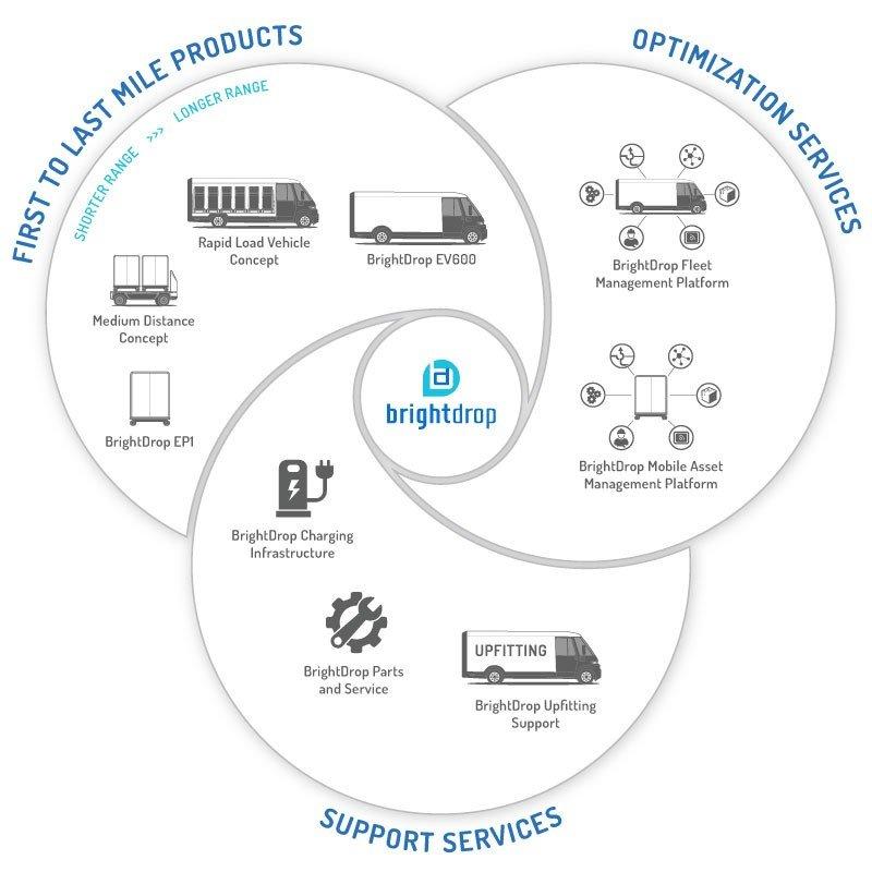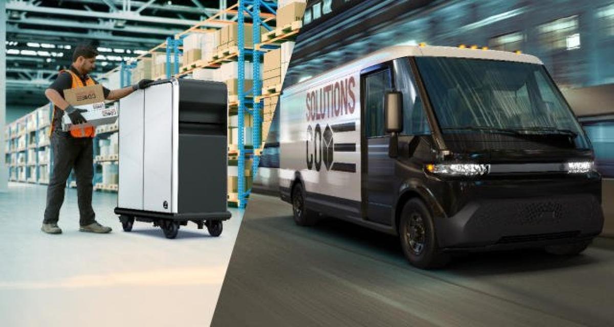 La solution comprend deux véhicules : le BrightDrop EP1, un chariot électrique, et le BrightDrop EV600, un fourgon électrique.