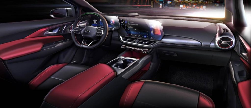 A l’arrière, hop un bandeau lumineux et un arrière qui remonte pour « dynamiser » le profil. Parlons-en du profil…carrosserie bi-ton avec toit noir, et montant arrière façon aileron de requin. Bref, on attend de voir le vrai véhicule à la fin 2023, mais on pourrait y mettre n’importe quel badge. L’Equinox sera disponible en finition LT (la grise) ou en RS (la rouge) qui se veut plus sportive.