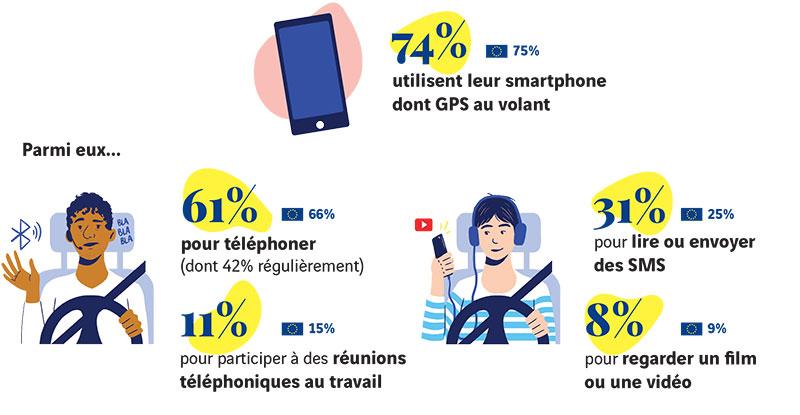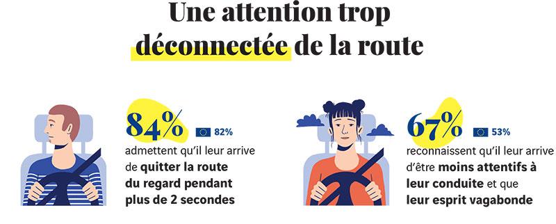 La distraction au volant ne concernent pas que les accros au téléphone. En effet, 67% des interrogés évoquent des "vagabondages". Les pensées s'envolent vers un souci, une problématique de la journée, etc. et l'attention disparaît. 74% des conducteurs utilisent leur smartphone en conduisant. Evidemment, toutes ces absences ou inattentions ne mènent pas à un accident heureusement. Mais cela peut occasionner une dérive de voie et potentiellement un accident corporel, voire mortel.