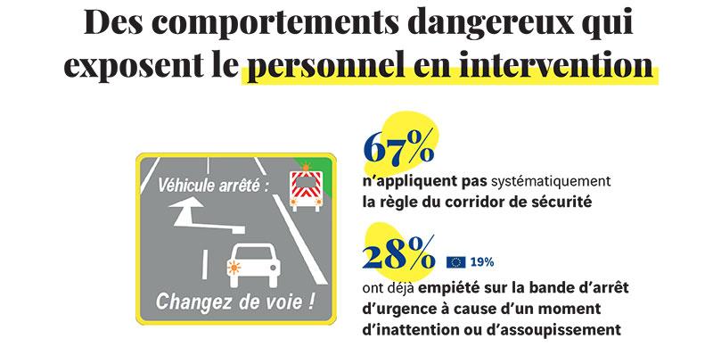 Depuis 2018, le corridor de sécurité est dans la loi. Il consiste à ralentir à l'approche d'une zone d'intervention ou d'un véhicule patrouilleur, de dépannage, etc. et de changer obligatoirement de voie si celle sur sa gauche est libre. C'est une obligation et non une recommandation élémentaire de prudence.