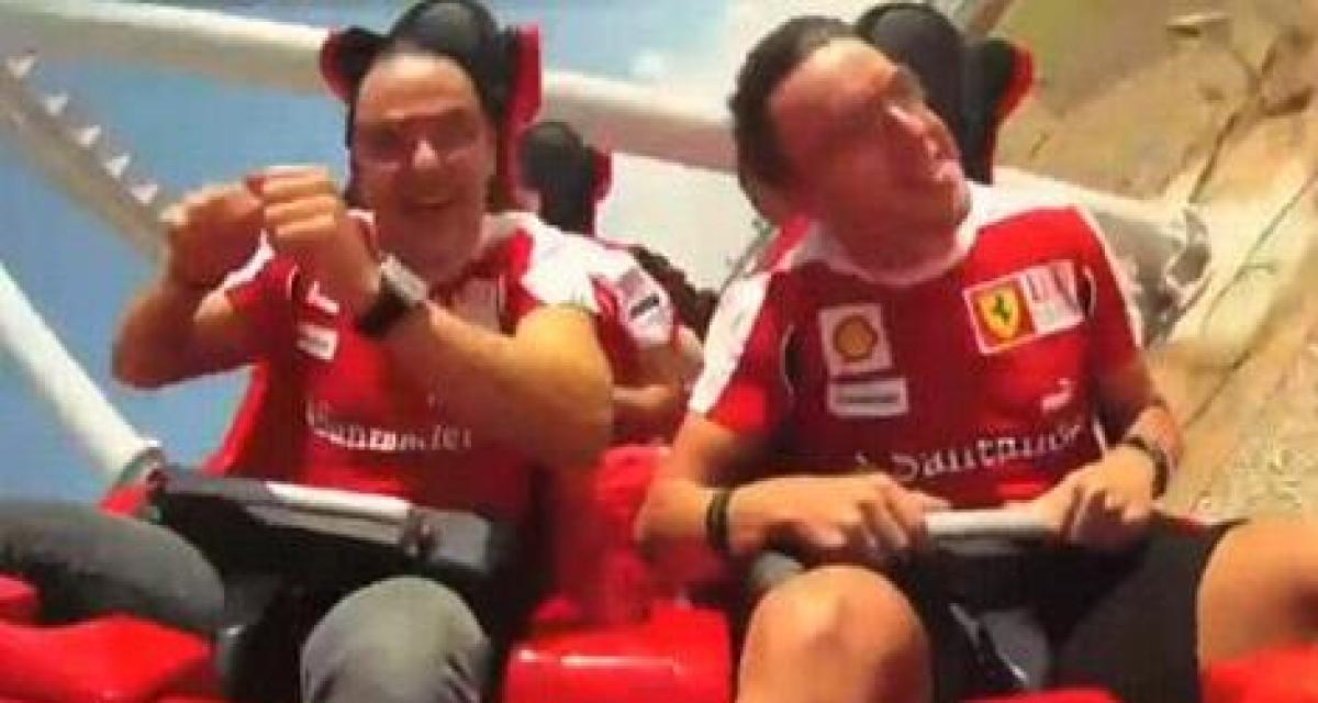 Ah oui, c’était avant ce dimanche, jour qui l’aura vu tout perdre suite à une calamiteuse gestion du GP… On peut donc retrouver ici Fernando Alonso et son coéquipier Felipe Massa qui s’offrent un tour de manège. Un véritable tour de manège puisque les deux pilotes de la Scuderia Ferrai testent l’une des attractions du parc Ferrari World.