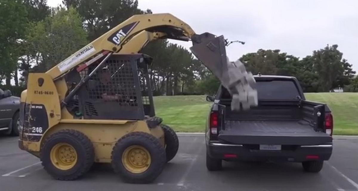 Honda installe son Ridgeline au centre du jeu avec un test identique (sur un des différents tests menés) : un lâcher de dizaines de blocs de cailloux pour un poids grosso modo équivalent à environ 360 kg.