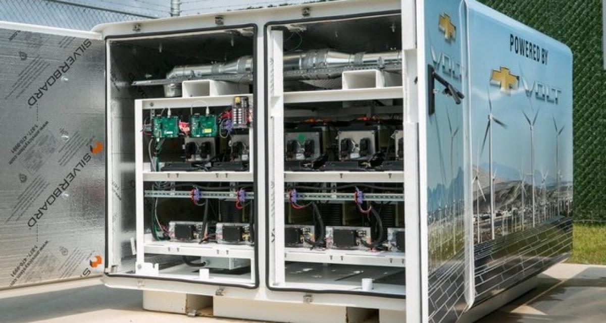 Cinq batteries usagées de la Volt s’offrent une autre vie comme source d’éclairage. Le constructeur américain apporte des précisions à ce sujet. Dans les faits ? Un générateur solaire au sol de 74 kW jumelé à deux éoliennes de 2 kW « alimentent le panneau à disjoncteurs de l’immeuble, où cinq batteries de voiture Volt fonctionnent en parallèle pour fournir de l’électricité ».