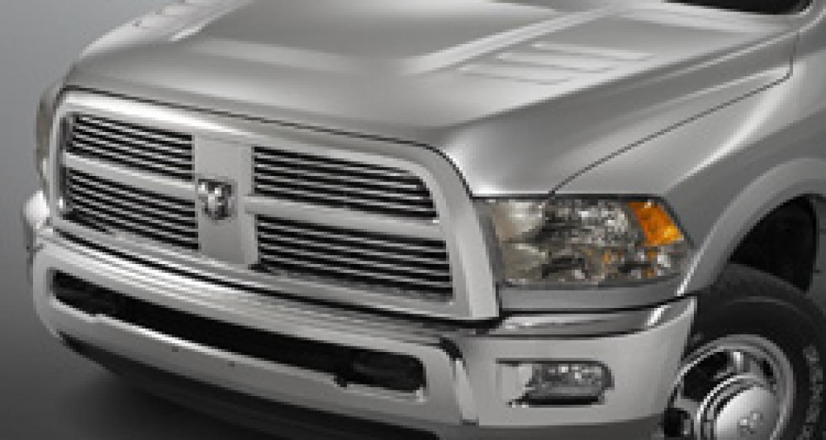 Chez Dodge, on retrouve donc les Ram 2500 et 3500 Heavy Duty, proposés en cabines Regular Cab, Crew Cab ou Mega Cab, auxquels vient s’ajouter les 3500 / 4500 / 5500 déclinés en version châssis-cabine uniquement. Bien entendu, pour répondre aux besoins des professionnels, seuls les moteurs les plus puissants sont retenus, en l’occurrence le V8 5.7 HEMI de 383 ch / 542 Nm, mais surtout le 6 cylindres en ligne Cummins 6.7 Turbo diesel. Développant 350 ch et 881 Nm, et associé au choix à des boites manuelles ou automatiques à 6 rapports, il sera sans doute le plus vendu de cette gamme. Le constructeur met en avant non seulement le couple de cete engin, mais aussi sa durabilité, puisque Chrysler revendique une durée de vie de 350.000 miles (560.000 km) en usage intensif de remorquage, si l’intervalle d’entretien de 7.500 miles (12.000 km) est respecté. Côté dépollution, il est doté d’un filtre à particules ainsi qu’un système SCR de réduction des émissions de NOx utilisant le principe de l’injection d’urée (type AdBlue).