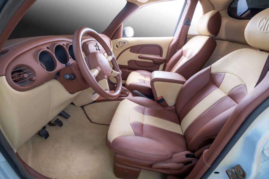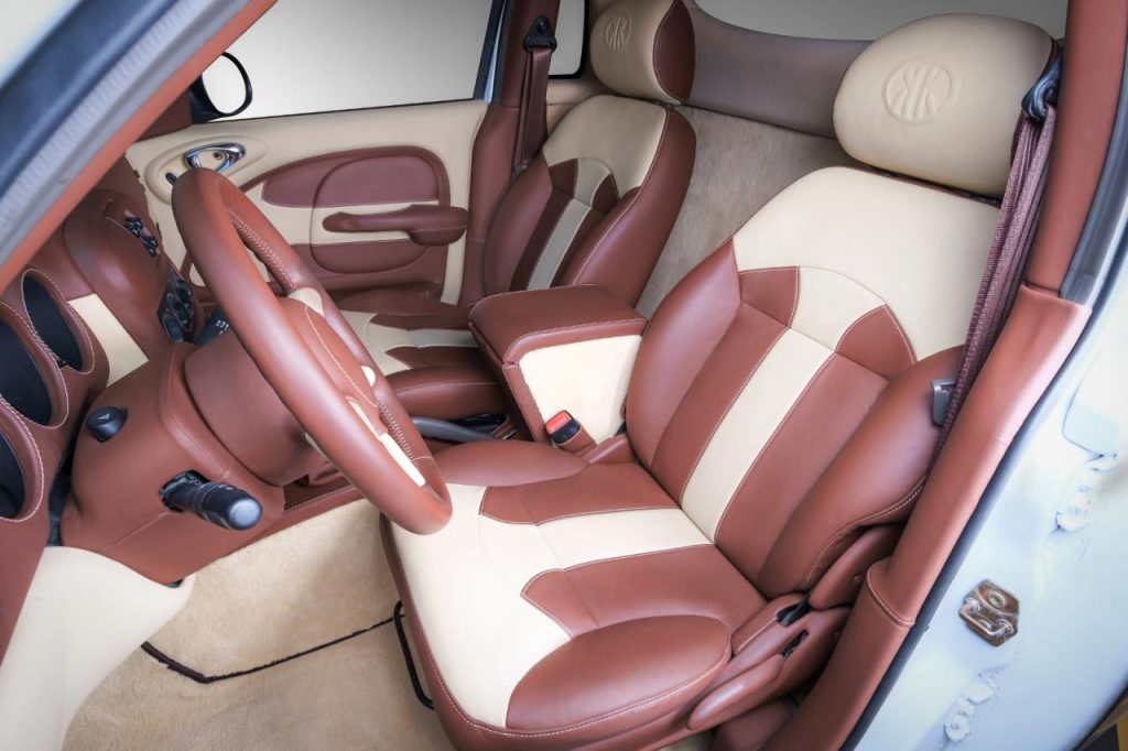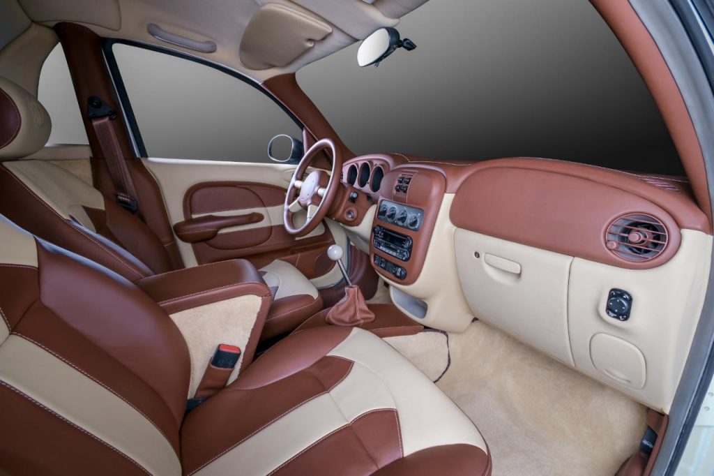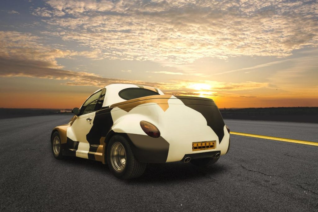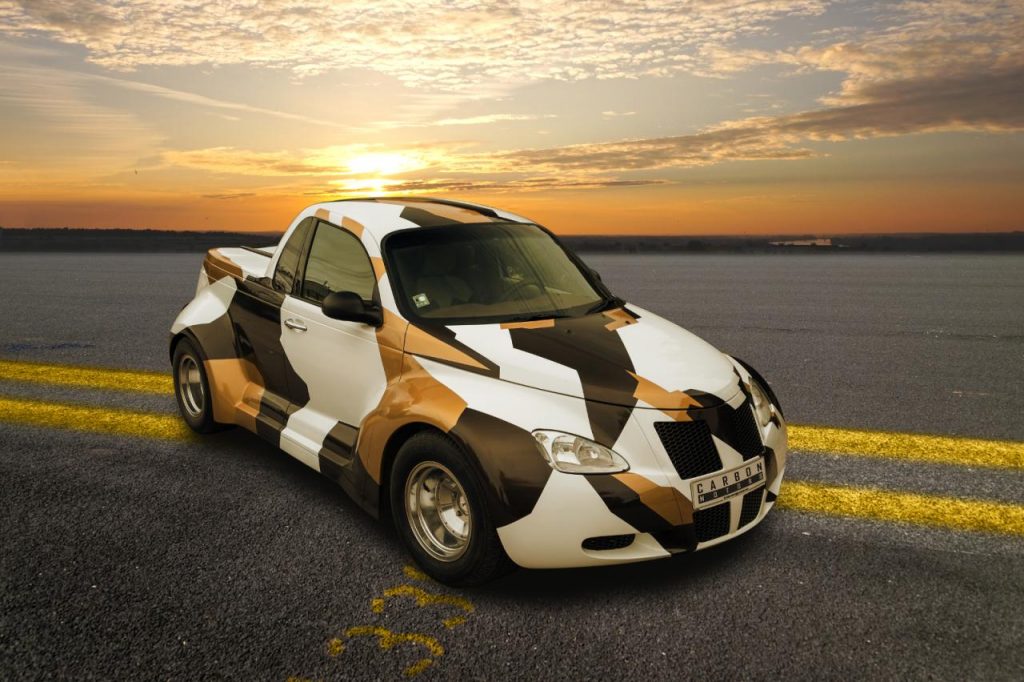 Pour enfin renforcer le caractère unique de ce Chrysler PT Cruiser pick-up, la carrosserie reçoit une teinte camouflage mêlant le blanc, le noir et l’or.