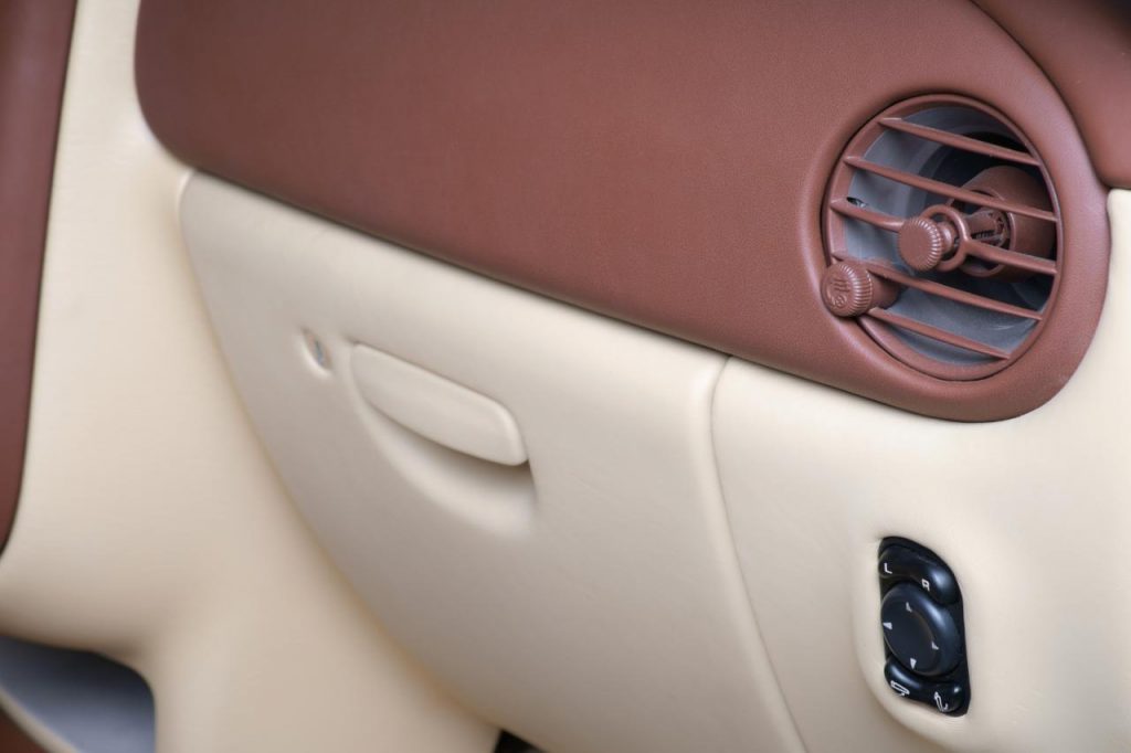 L’intérieur n’échappe pas non plus à cette préparation avec une sellerie en cuir bi-ton rouge et beige ainsi qu’une console centrale customisée.
