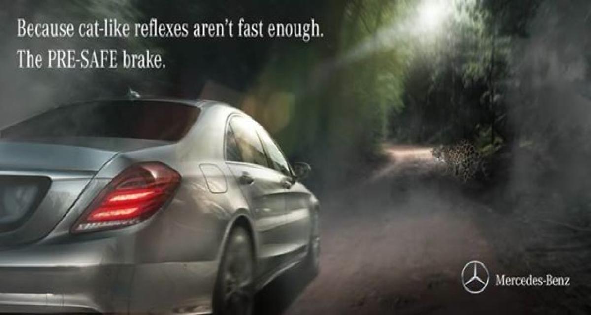 La règle de la concurrence voudrait que le leader Mercedes ne réagisse pas aux réflexes de chat de la marque britannique, histoire de ne pas légitimer le challenger, mais l’attaque a porté et Mercedes vient de répliquer avec le visuel présenté en ouverture du post, où le Jaguar est sous la menace directe de la Classe S, n’était-ce cette autre technologie introduite par Mercedes, le freinage d’urgence PRE SAFE, « parce que les réflexes de chat ne sont pas assez rapides. »