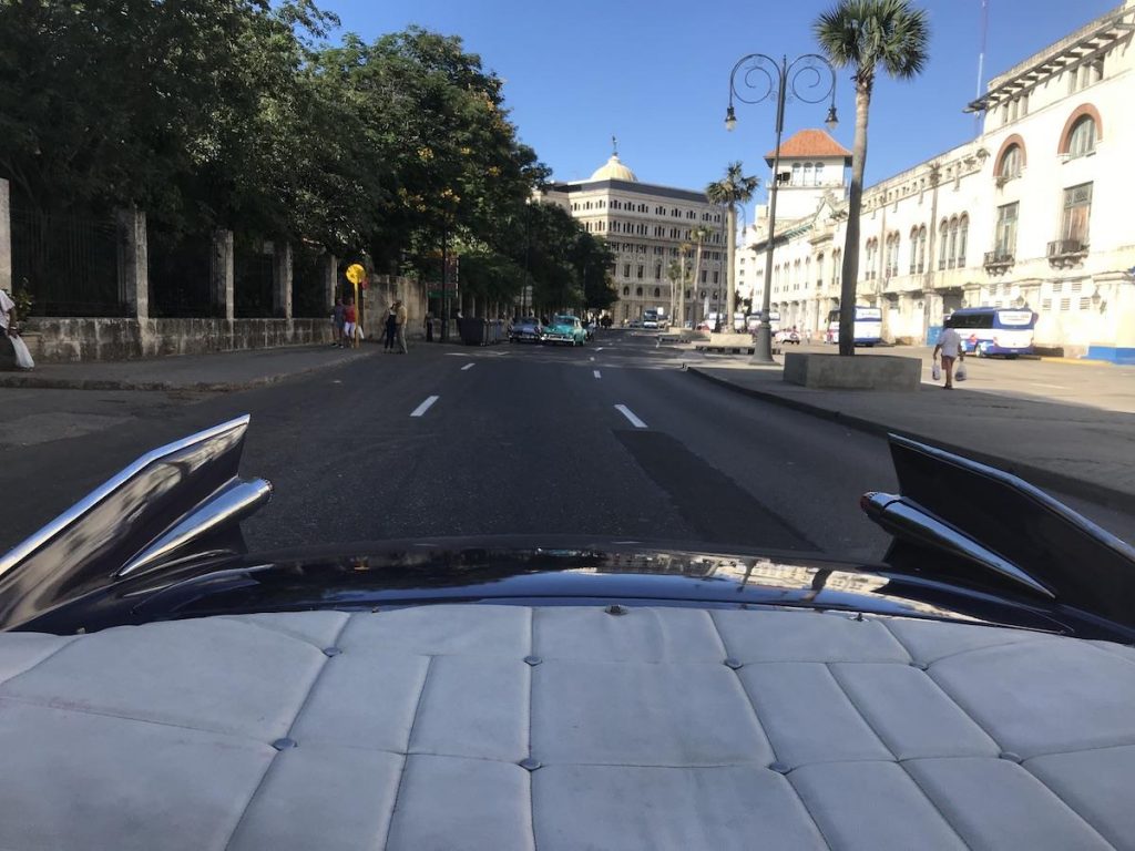 Après une longue exploration de la Havane, je trouve une perle rare dans cet océan d’Américaines retapées, généralement mises au service de la balade touristique par des hôtels ou des sociétés spécialisées. Un cabriolet Cadillac Eldorado Biarritz de 1959, précisément l’année de la révolution Cubaine : le summum du luxe à l’époque de sa sortie aux Etats-Unis, et le symbole absolu de la décadence stylistique américaine des années 60. Je remarque une carrosserie patinée par le temps sous sa nouvelle couleur violette, mais son capot cache le V8 d’origine et non pas un bloc chinois moderne. Moyennant un prix de 120 Peso Convertibles (100€) me voilà parti dans une balade de trois heures, conduit par son chauffeur aux alentours de la Havane (en passant par la fameuse maison d’Hemingway). Icône capitaliste échouée en plein régime communiste, l’Eldorado en impose sous le soleil des tropiques. Mais la flamboyance de sa prestigieuse carcasse ne suffit pas à masquer le triste état de ses dessous usés jusqu’à la moelle. La plupart des cylindres de son V8 manquent aujourd’hui à l’appel, et dans les côtes la grande Cadillac se fait klaxonner par les nouvelles voitures chinoises. L’amortissement n’a plus rien de confortable, le plein d’essence se fait via un bidon dans le coffre (raccordé à la mécanique par un tuyau d’arrosage !), et il faut rajouter de l’eau toutes les 20 minutes dans le moteur. Pire, un passage derrière le volant vous donne la désagréable sensation d’avancer vers une mort certaine : le jeu dans la direction est tel que rouler droit devient vite impossible, l’absence de direction assistée rend les virages éprouvants et le freinage fonctionne aussi bien que l’Internet cubain. Après de grosses sueurs froides, vous rendez donc le volant à son chauffeur expérimenté en contemplant, arrêté près de la mer, une scène absolument surréaliste. Celle d’un monument de l’ostentation américaine pré-choc pétrolier, posée juste devant l’ancienne ambassade de l’URSS construite au plus fort de la guerre froide.
