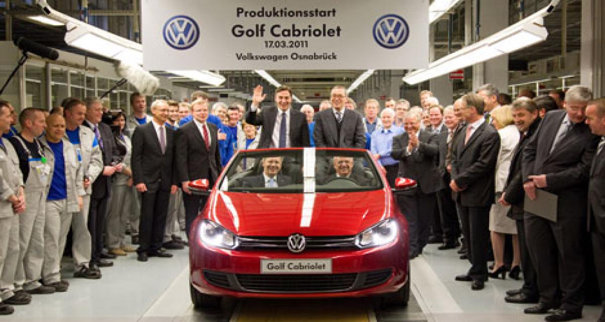 A quelques jours du printemps, la Golf cabriolet a débuté se production dans l’usine Volkswagen d’Osnabrück. Une cérémonie officielle s’y est déroulée, en présence des huiles du constructeur (Martin Winterkorn et Hans Neumann pour les plus galonnés), mais aussi de la politique. Etaient ainsi présents David McAllister, premier ministre de Basse-Saxe, ainsi que Christian Wulff, le président allemand.