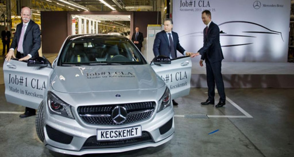 Ouverte en mars 2012, l’usine hongroise de Kecskemet a effectué sa montée en cadence en tant que second site d’accueil de la Classe-B, également produite à Rastatt. Depuis, 40.000 exemplaires du dernier monospace Mercedes ont été assemblés, et il est temps pour le site d’assurer sa première production exclusive avec la CLA. La berline / coupé a vu son premier exemplaire de série quitter les chaînes en présence du grand patron Dieter Zetsche. et du premier ministre hongrois Victor Orban.