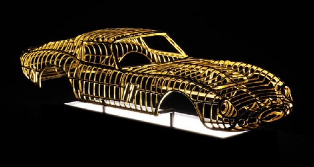 Entièrement galbées à la main à partir de gabarits, toutes les pièces sont ensuite soudées entre elles pour former une sorte de squelette de Ferrari. L’oeuvre terminée est recouverte de feuilles d’or 24 carats et disposée sur un socle d’ébène.