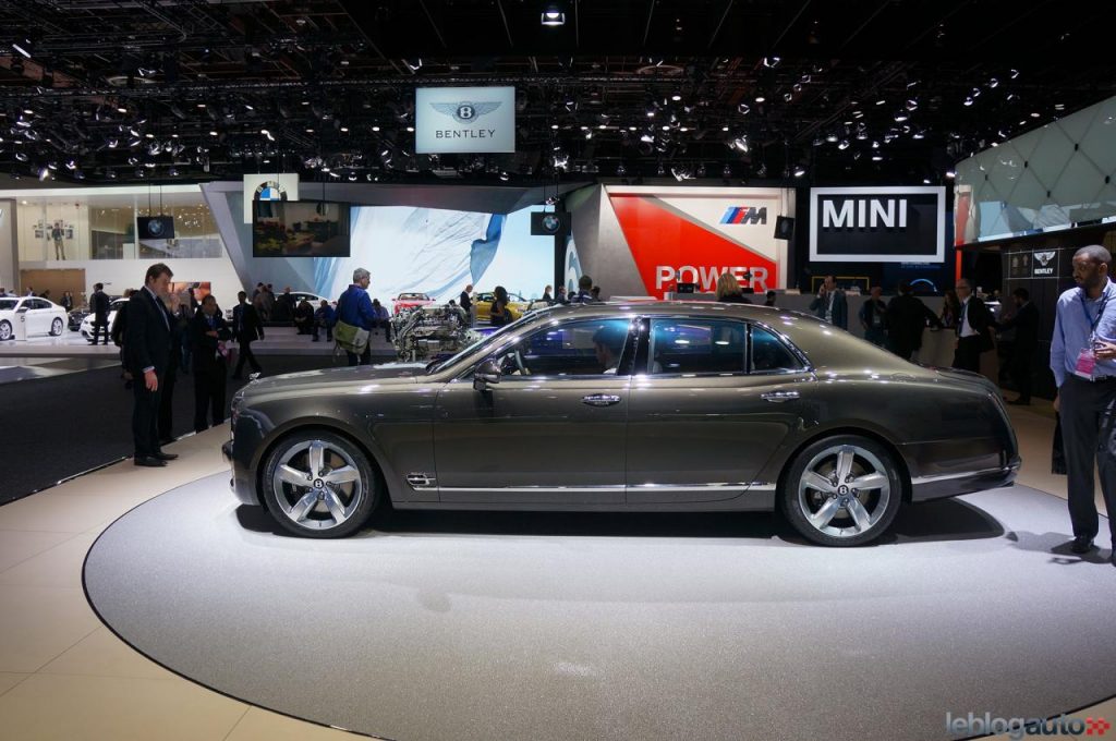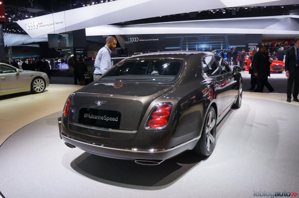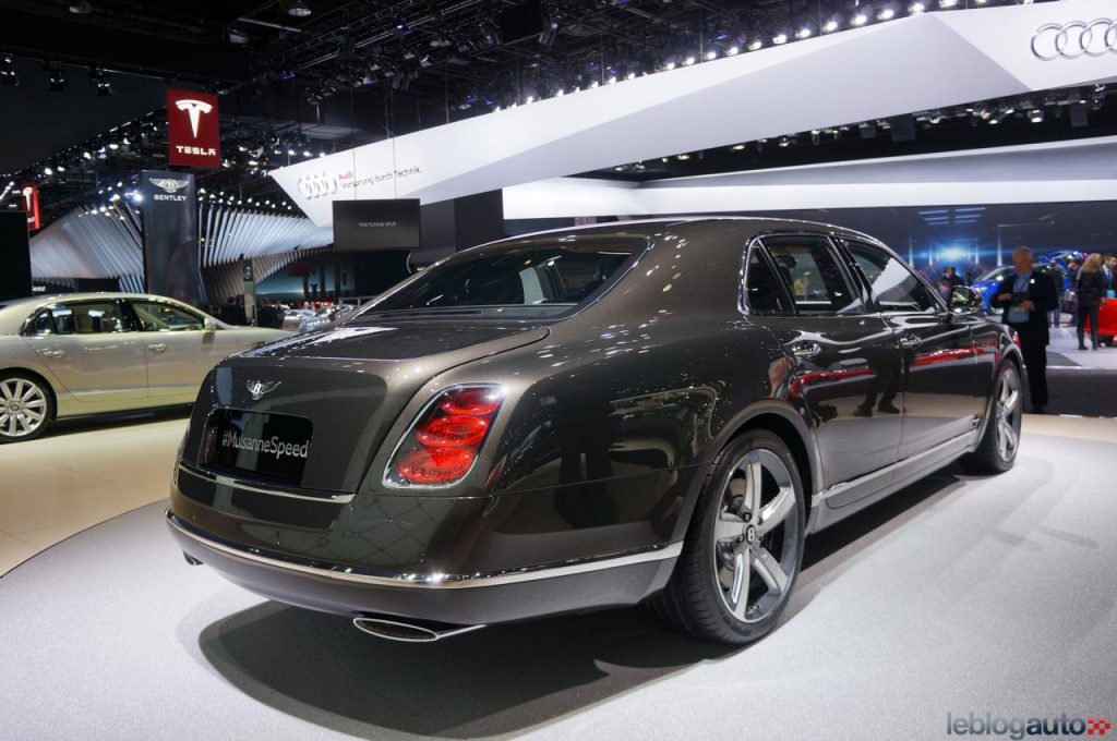 La Bentley Mulsanne Speed, c’est un V8 de 6,75 litres retravaillé pour obtenir la puissance de 537 chevaux mais surtout un couple de 1100 Nm que doit encaisser la boîte automatique à 8 rapports (avec palettes au volant). Un déchaînement de couple moteur pour arracher la « baleine » de chez Bentley (2,7 tonnes à vide) et lui permettre de faire le 0 à 100 km/h en 4,9 secondes. De quoi donner le sourire au chauffeur de maître.
