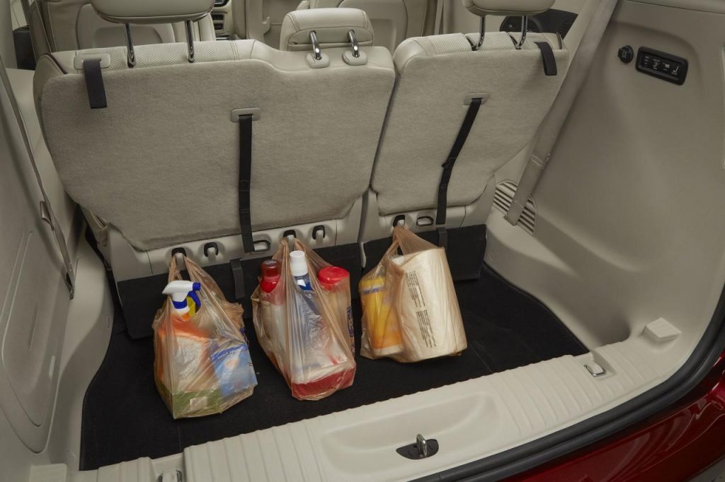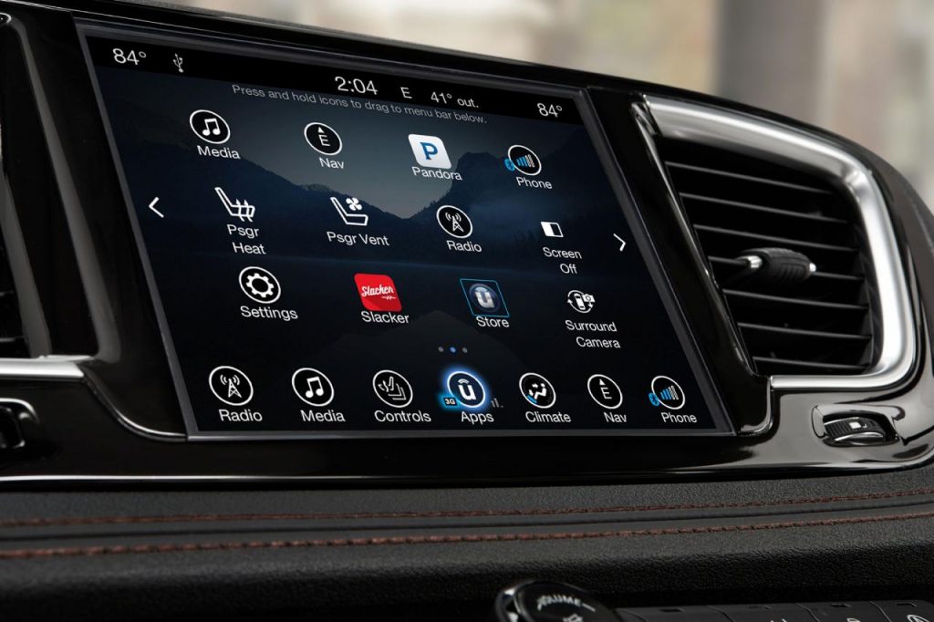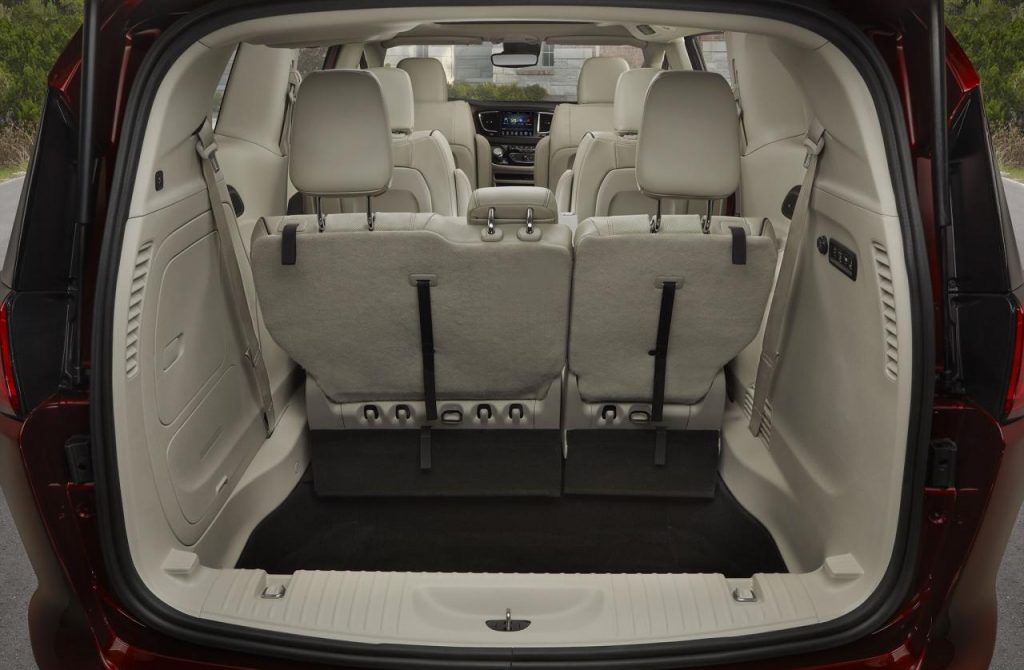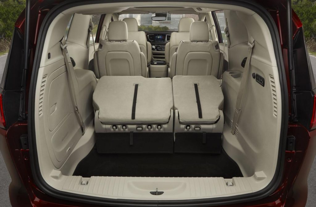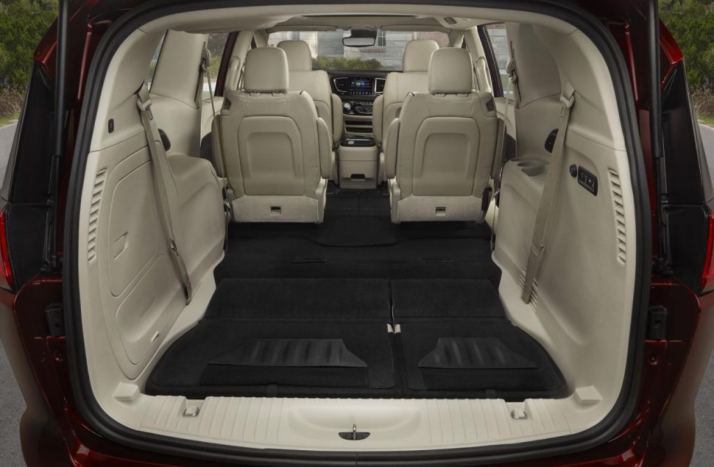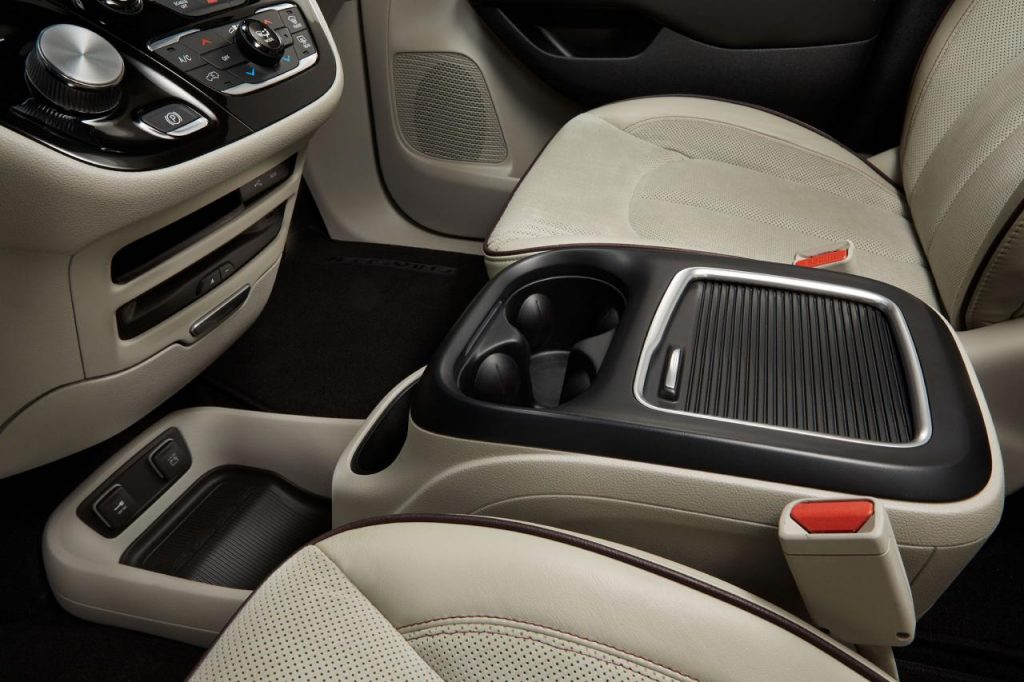 L’habitacle regorge de rangements, de crochets, et continue à proposer la fonctionnalité Stow’n’Go qui permet de ranger totalement les sièges du rang 2 dans le plancher. Le fonctionnement en est facilité, et un siège additionnel peut s’installer entre les deux captain chairs, pour porter la capacité du Chrysler Pacifica à 8 passagers. Une fois replié, ce siège sert aussi d’accoudoir. Le troisième rang se replie, et de déplie électriquement au fond du coffre. Dans la foulée du Honda Odyssey, le Pacifica propose un aspirateur embarqué, intégré dans l’habillage du montant C. Au rayon des équipements à bord, le Pacifica embarque aussi deux écrans tactiles de 10 pouces pour les passagers arrière (avec contrôle parental, fonction « on est où / on arrive bientôt ? »…), un système de réduction active du bruit, et tout un arsenal d’aides à la conduite.