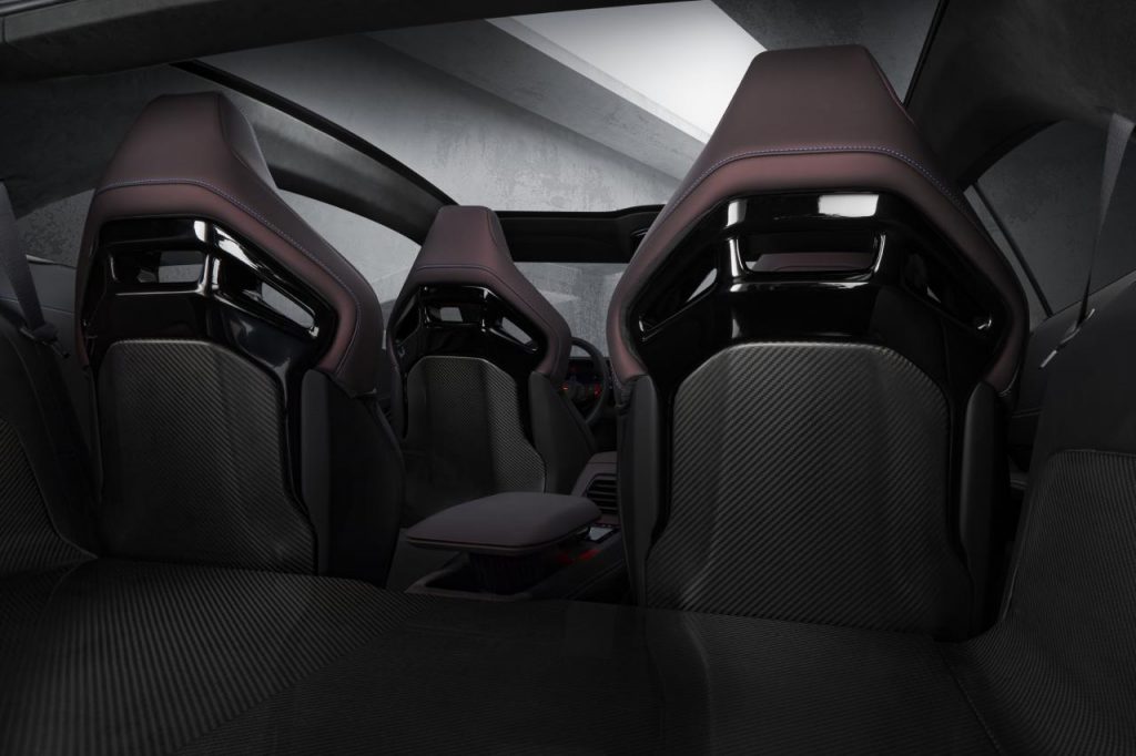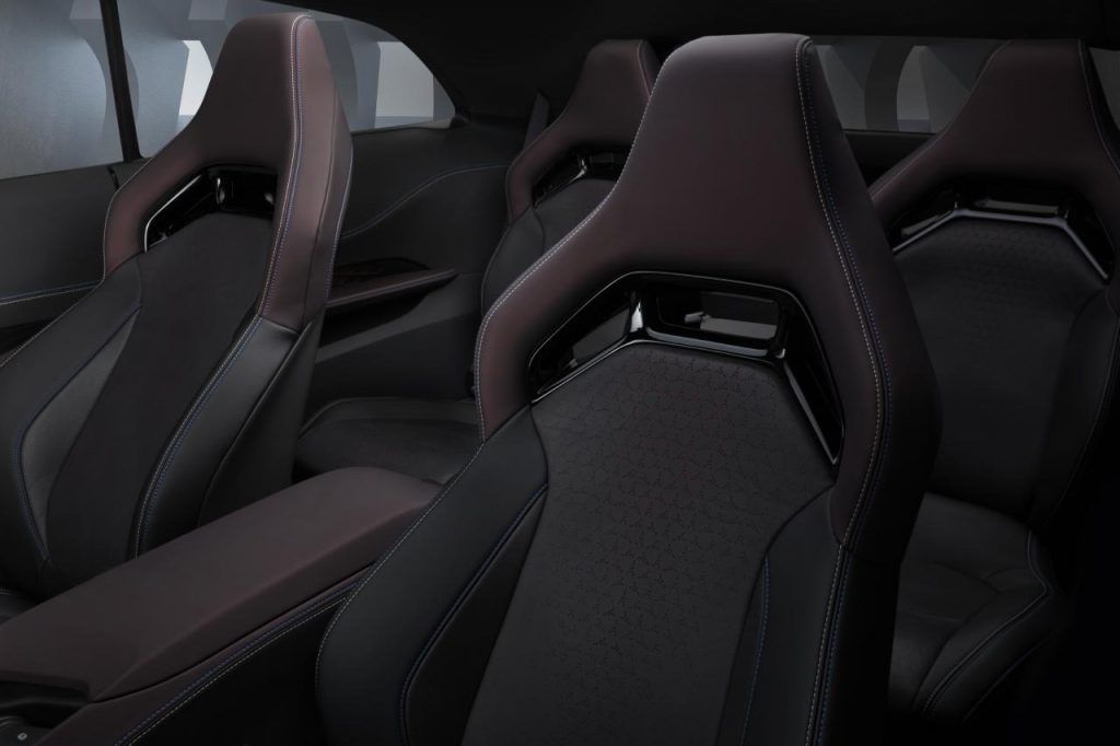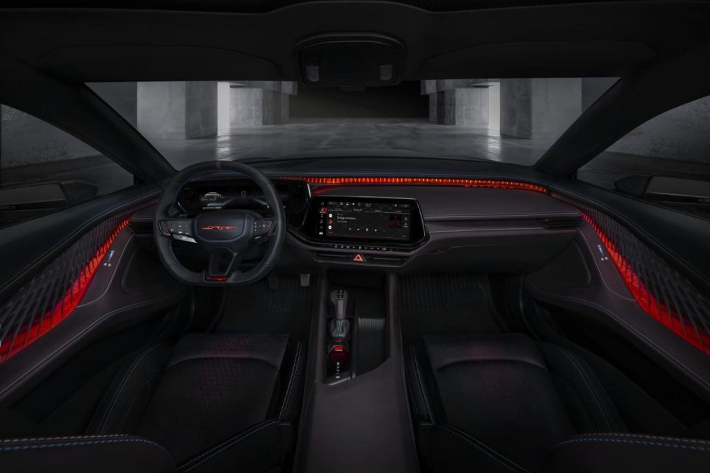 A l’intérieur du concept, L’écran central de 12,3 pouces, le plus grand d’un véhicule Dodge, s’incline de près de dix degrés vers le conducteur, et le groupe d’instruments de 16 pouces est incurvé, créant une sensation de cocooning axée sur le conducteur. Un affichage tête haute (HUD) de 8 x 3 pouces place des informations supplémentaires sur le véhicule là où le conducteur en a besoin. Le mince tableau de bord (IP) et le traversin central de couleur ultraviolet avec des surpiqûres bleues et argentées comportent une « ligne de flottaison » qui s’étend à travers la voiture. La couleur Ultraviolet touche également plusieurs surfaces intérieures, telles que la console, les portes et les sièges, créant un halo pour améliorer les ombres et les reflets. Une forme d’éclair unique sur la pédale d’accélérateur fait allusion au groupe motopropulseur électrifié du concept, tout comme les doubles coutures Blue Plasma et Silver qui entourent tout l’intérieur. Les seuils de porte en fibre de carbone comportent un lettrage Daytona blanc illuminé, avec un lettrage Daytona éclairé également trouvé en haut à droite de la mi-lunette.