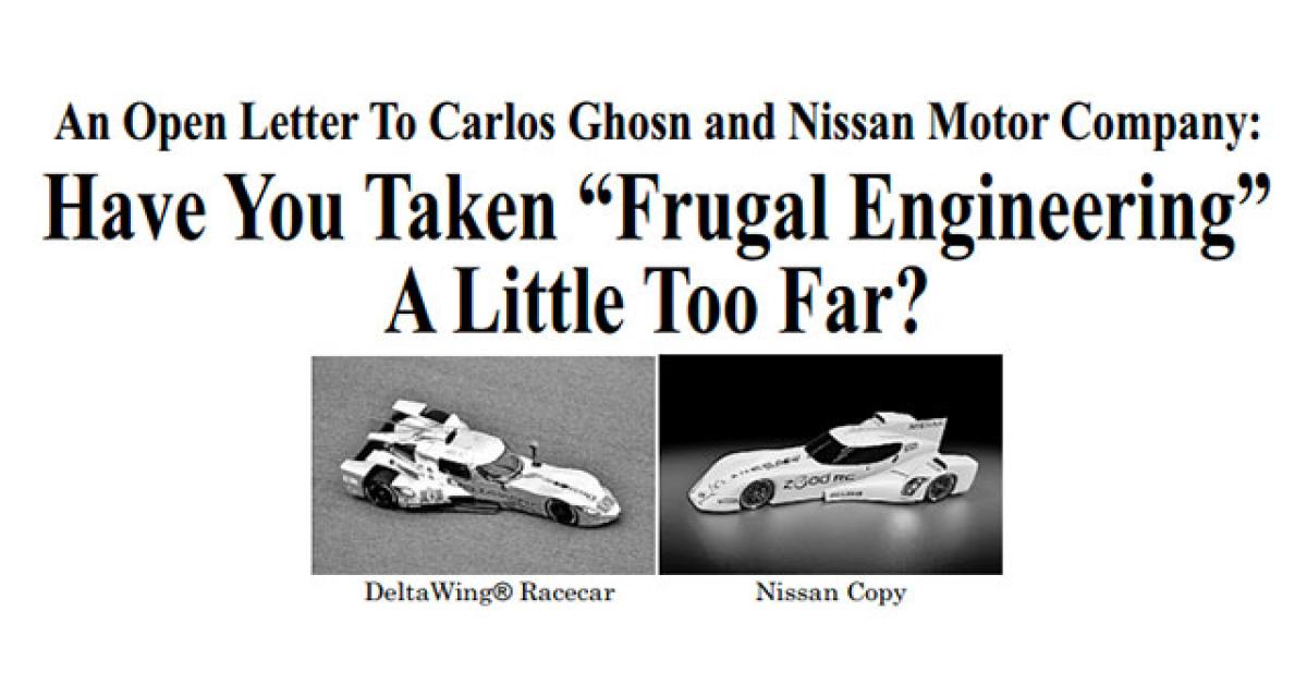 Panoz s’est offert hier une demi-page dans les journaux quotidiens desservant Nashville, là où est situé le siège américain de Nissan. où il s’adresse directement au président du constructeur japonais au-dessus d’un montage juxtaposant la Deltawing coupé qui court aux Etats-Unis et la ZEOD RC décrite sous un lapidaire « Nissan copy ». Le message est le suivant « Auriez-vous poussé le concept d' »ingéniérie frugale » un peu trop loin ? Au point de voler les idées des autres sans compensation. » Le texte cite ensuite les conclusions préliminaires, plutôt favorables au camp Deltawing, des poursuites engagés par Panoz contre Nissan, et se termine sur une proposition de négociation.