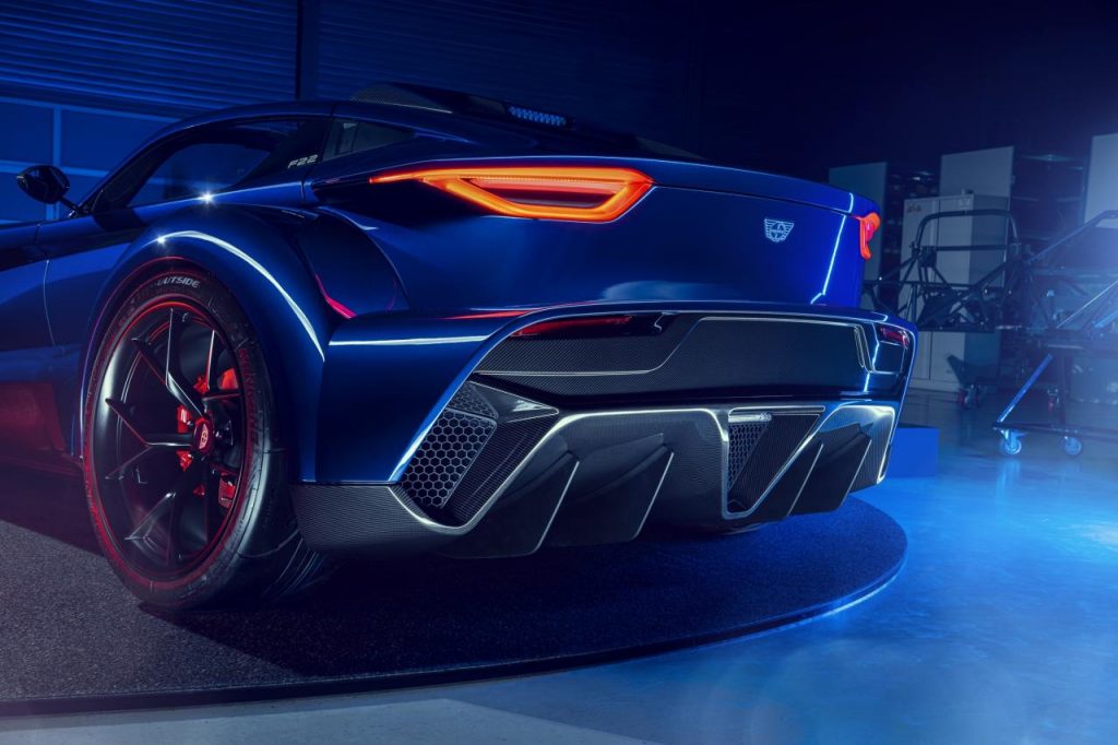 La F22 conserve quelques fondamentaux stylistiques de Donkervoort avec des roues avant en partie non carénées, un long capot, des tuyaux d'échappement latéraux et des éléments de style agressifs. Les roues arrière sont mieux intégrées à la carrosserie grâce aux ailes plus larges, améliorant la posture et l'aérodynamisme. La voiture de sport de 4039 mm de long est également dotée de portes papillon, d'un éclairage entièrement à LED et d'un toit amovible en fibre de carbone Twin Targa qui la transforme en roadster.
